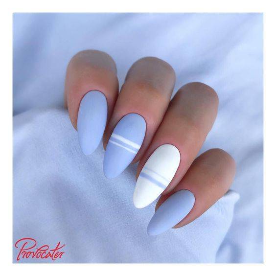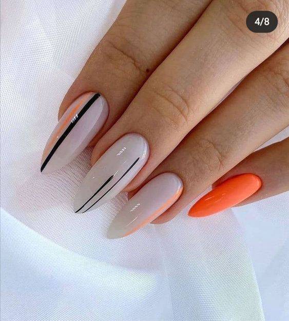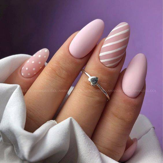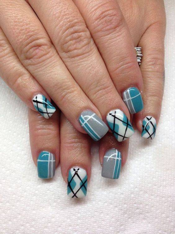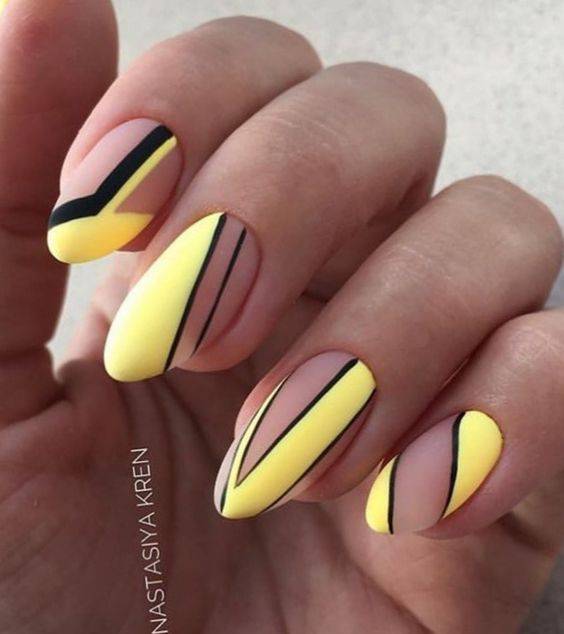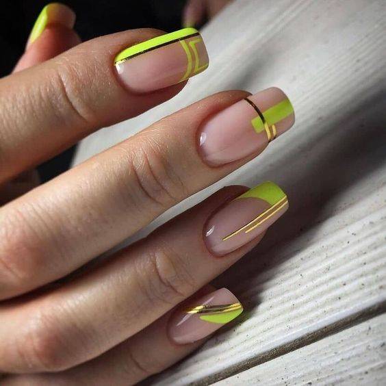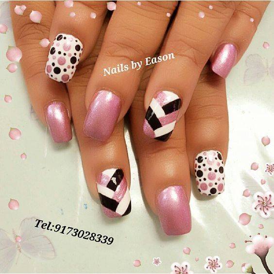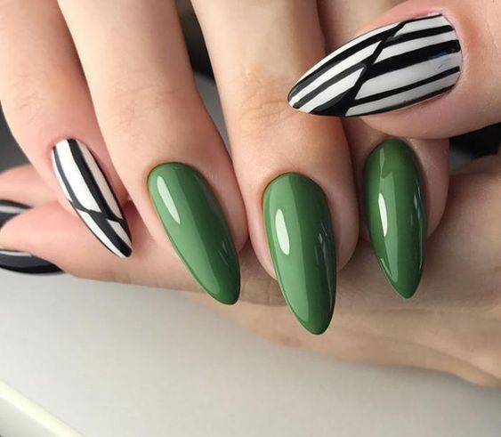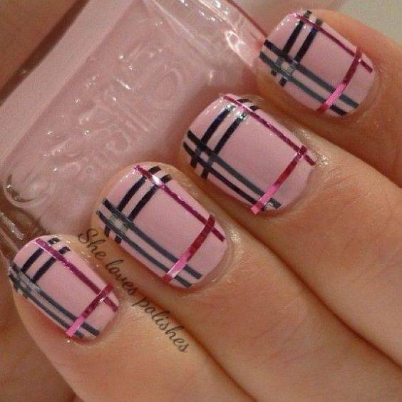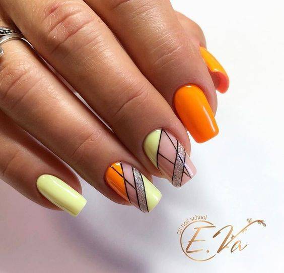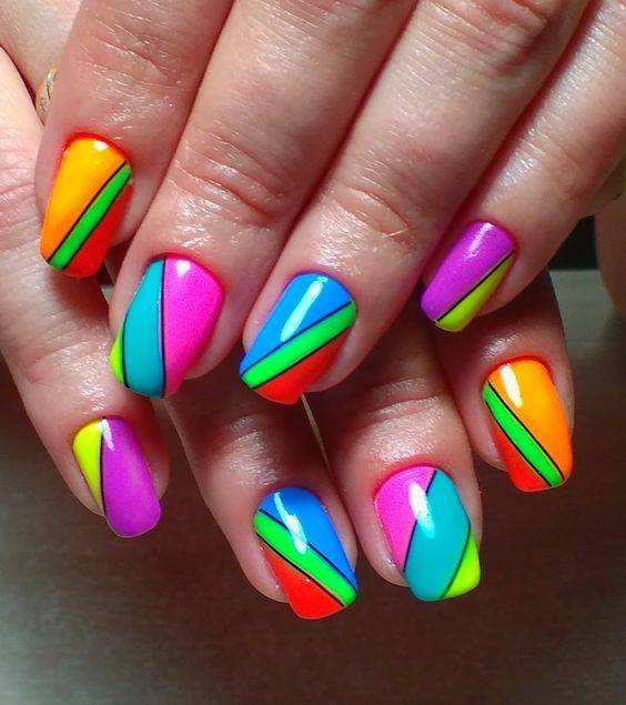 Именно полоски в большей степени нацелены на перспективу. Они способны визуально удлинить поверхность или наоборот. Достаточно взять несколько оттенков, но не более четырёх. Для нанесения полос можно использовать глиттер, фольгу или акриловый песок.