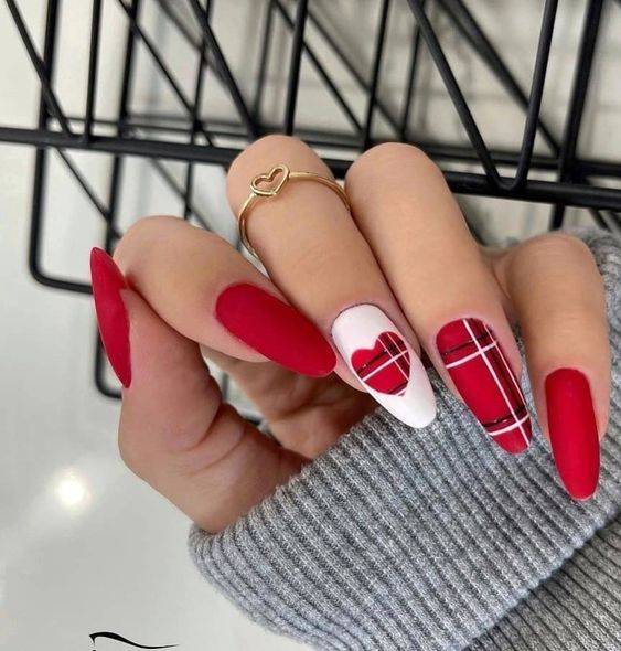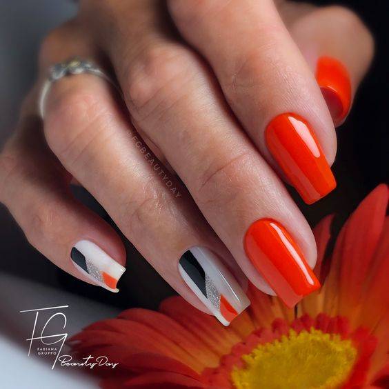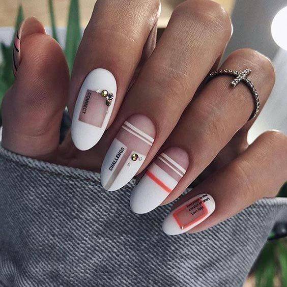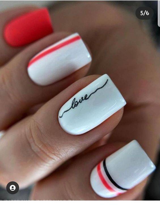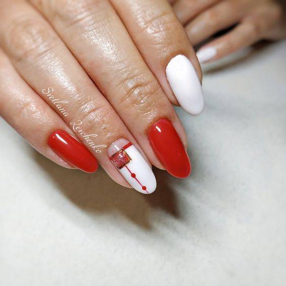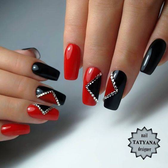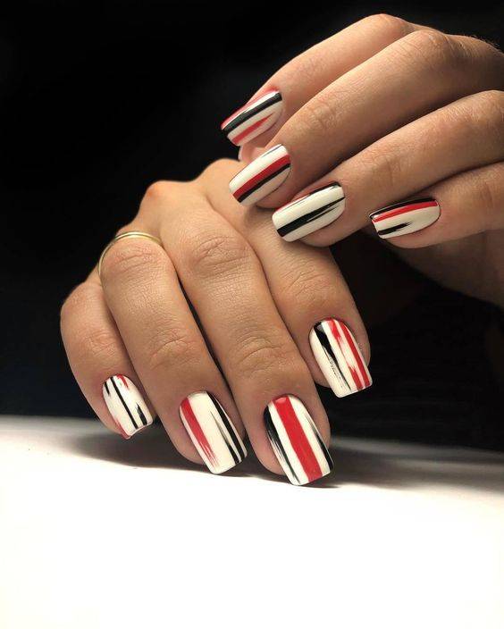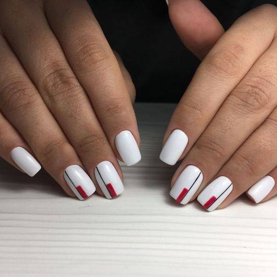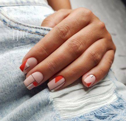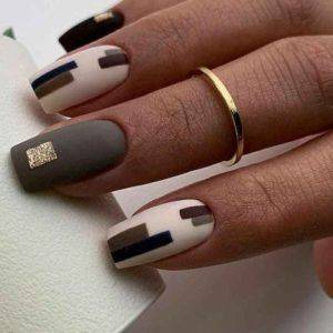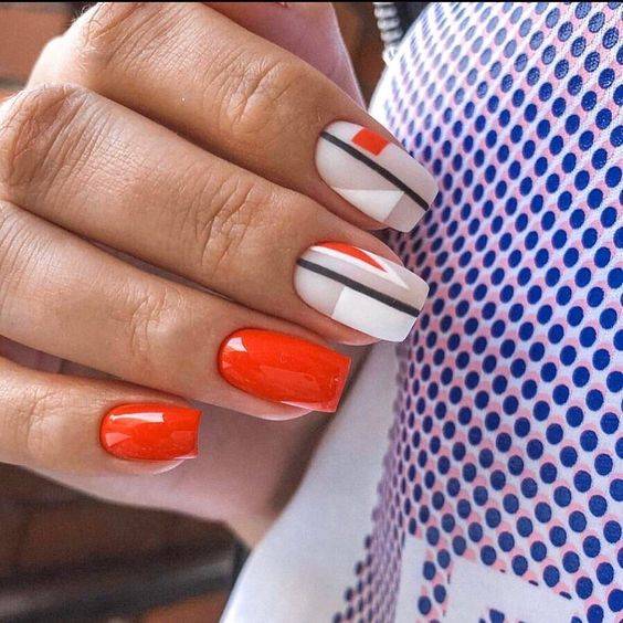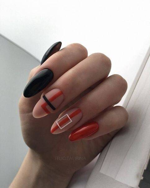Дизайн ногтей «Графика» с использованием оттенков красного, бежевого, белого и черного не выходит из моды. Геометрия подходит под разную форму ногтей. Особенно эффектно будут смотреться контрастные сочетания, к примеру белые полосы на черном матовом фоне.