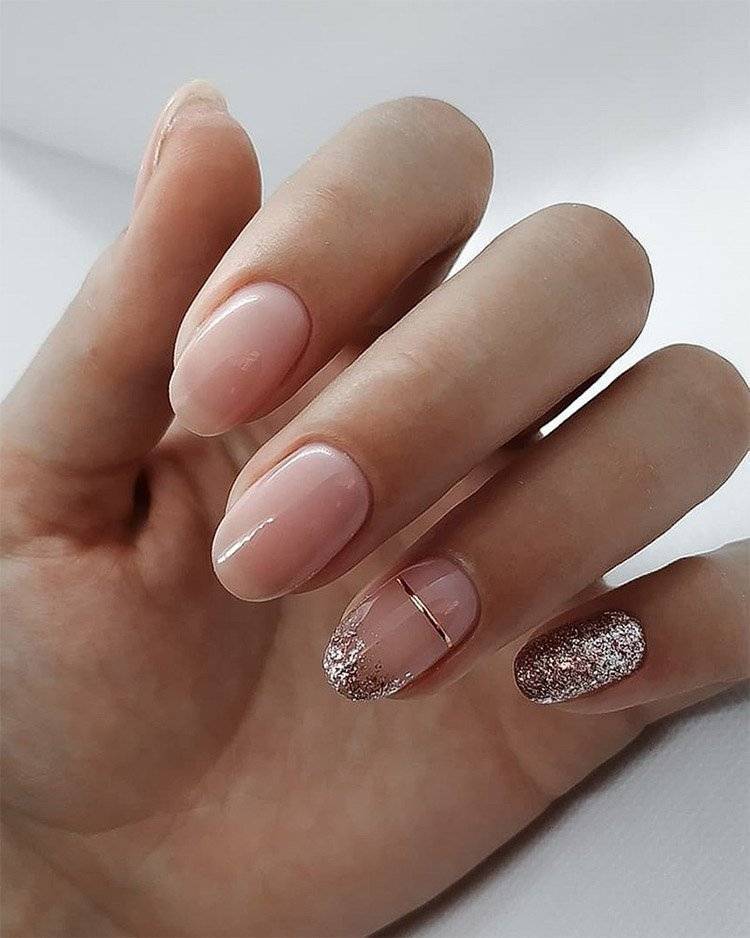 Хорошая идея – сделать продольную линию на безымянном пальце, в дизайне применить стразы, градиент, фольгу. Постарайтесь сделать так, чтобы линии были симметричными, это позволит подчеркнуть эксклюзивность маникюра. Для его создания применяют кисть лайнер или заранее наносят на поверхность ногтей разметку, используют самоклеящиеся полосы.