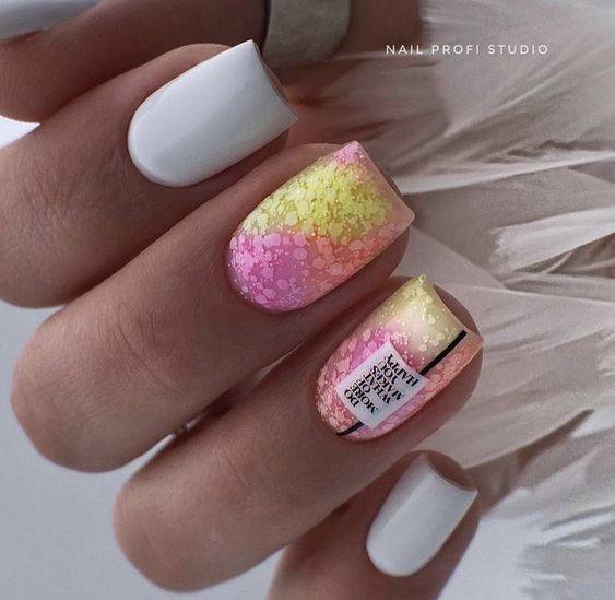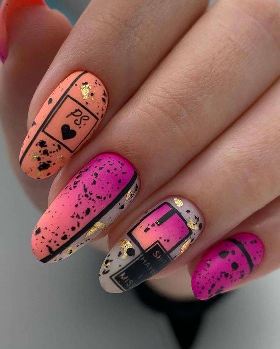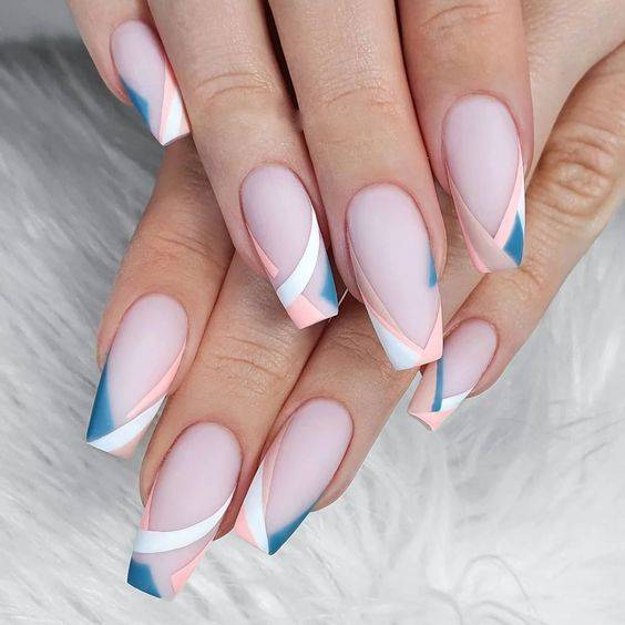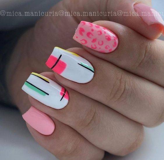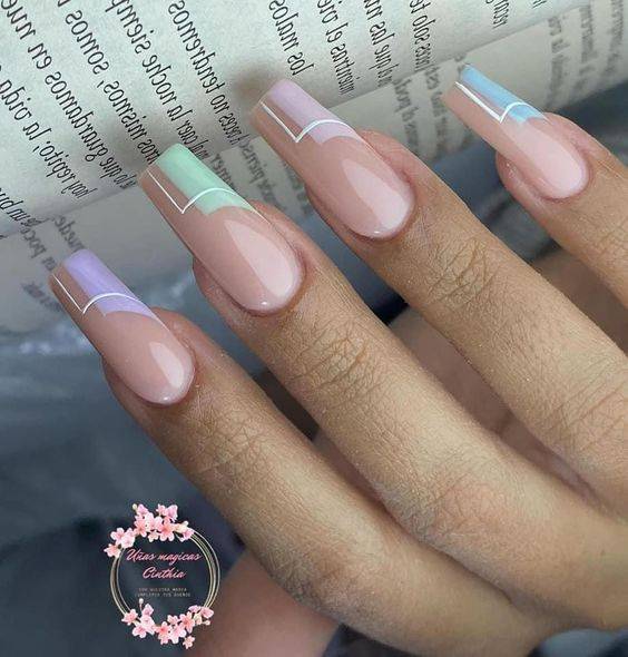 В нейл-арте есть множество идей дизайна. В маникюре «Негативное пространство» виден натуральный цвет ногтя, на лаковом покрытии – картинки. Применяют разноцветную палитру в такой геометрии, украшением является фольга. Чтобы создать эффект «Негативное пространство» надо использовать базу каучук или полупрозрачные виды лака.