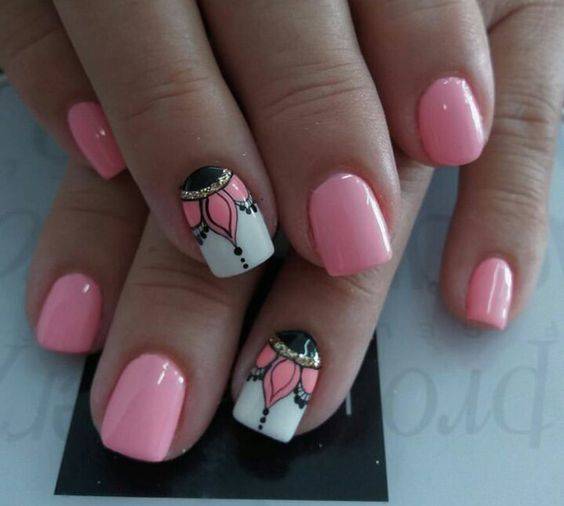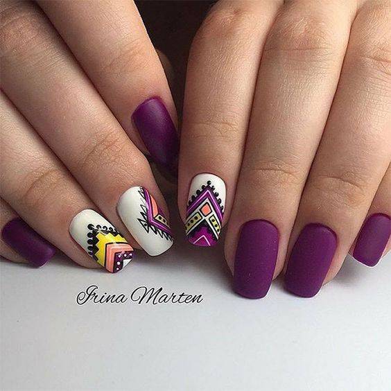 Для выполнения орнамента используют простые фигуры. Отличный вариант для этнического френча. Он может дополнять рисунок или подчёркивать френч. Хорош вертикальный орнамент, вытягивающий ноготок.