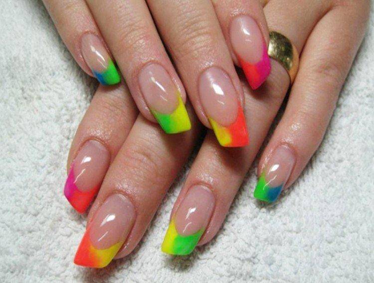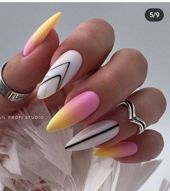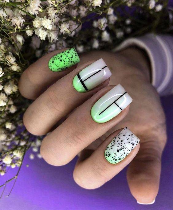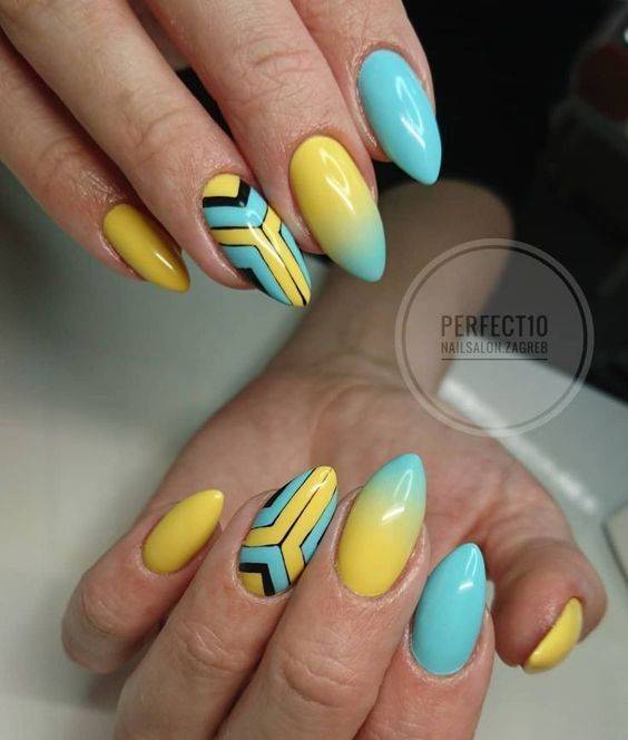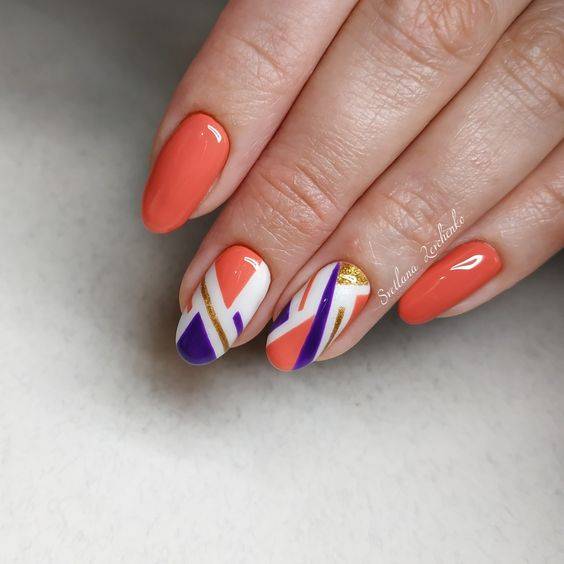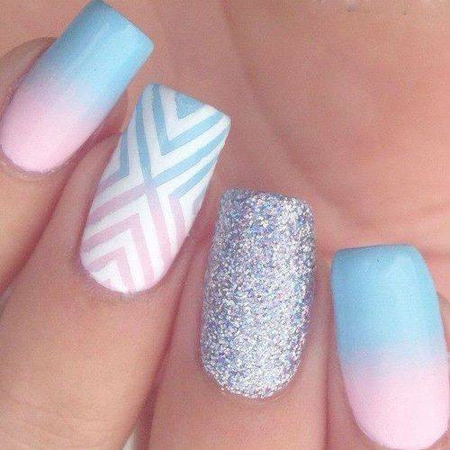 С помощью геометрии вполне можно выполнить градиент. Результата достигают с помощью повторения, нанося линии в несколько этапов. Чем больше этапов, тем интересней маникюр. Для плавного перехода обычно смешивают лаки в равных пропорциях.