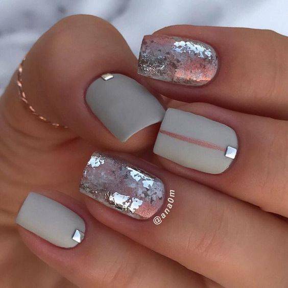Чтобы получить яркий маникюр, надо применить фольгу, разрезать ее на несколько небольших кусочков треугольной формы, аккуратно уложить под поверхность лака. Эффект преломления света будет смотреться очень интересно. Маникюр-геометрия «Битое стекло» часто выполняют с использованием прозрачной основы, но можно выбрать и цветное покрытие.