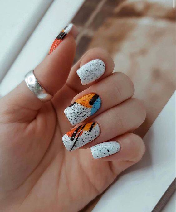 Техника требует умения и опыта. Но смотрится великолепно. Эдакая живопись на ногтях, даже если это только геометричные брызги или абстракция.