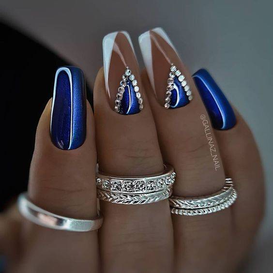 Геометрический маникюр с эффектом кошачьего глаза – самый подходящий вариант для вечернего образа. Он выглядит просто потрясающе, особенно при использовании темных лаков.