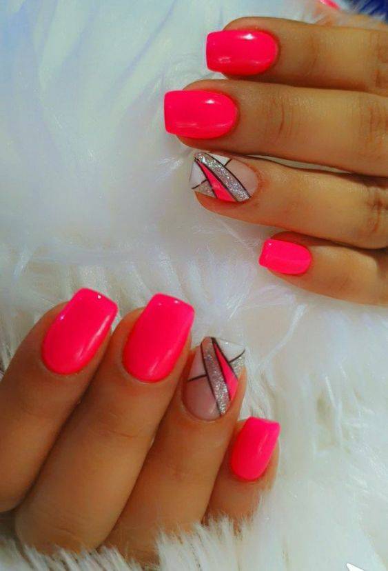 Геометрия на ногтях сочетается с ярким декором. Смело используйте камешки, стразы, блестки. В качестве декора можно выбрать абстрактный элемент, создать аппликацию в виде квадрата, ромба, треугольника.