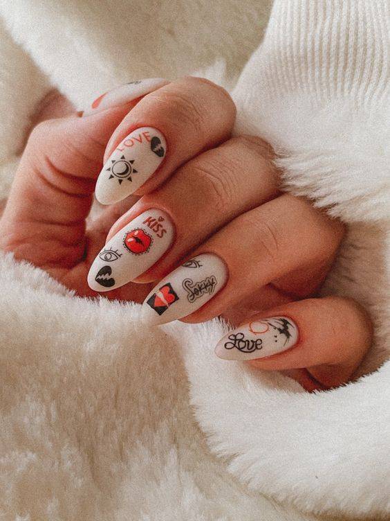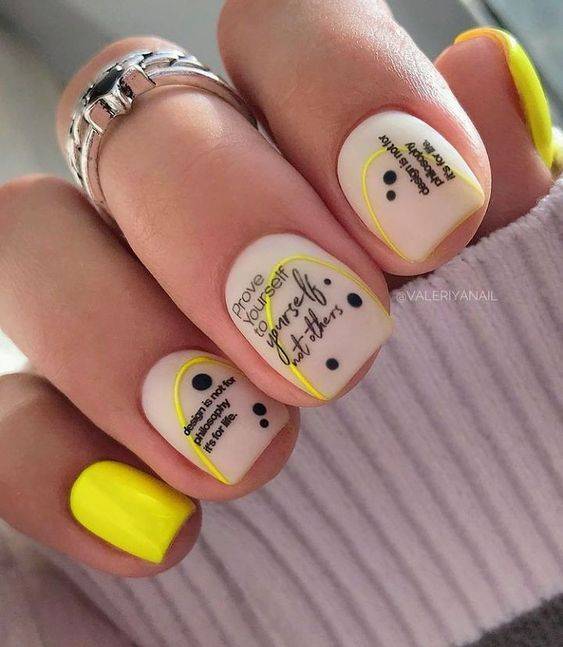 Вручную сделать надпись на ноготке очень сложно, ведь она расплывается и не всегда получается чёткой. Готовые наклейки решат проблему: они выполняются в разнообразных стилях, разными шрифтами и цветами, могут быть мелкими и объёмными.