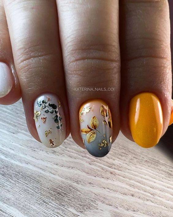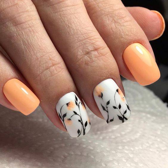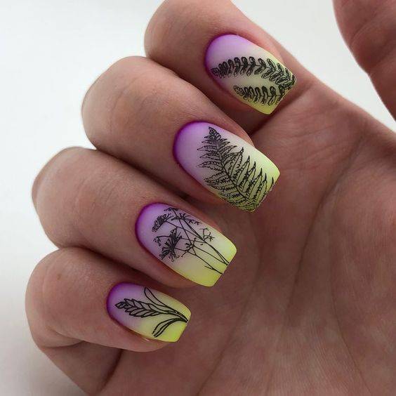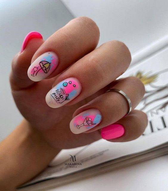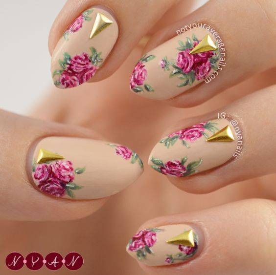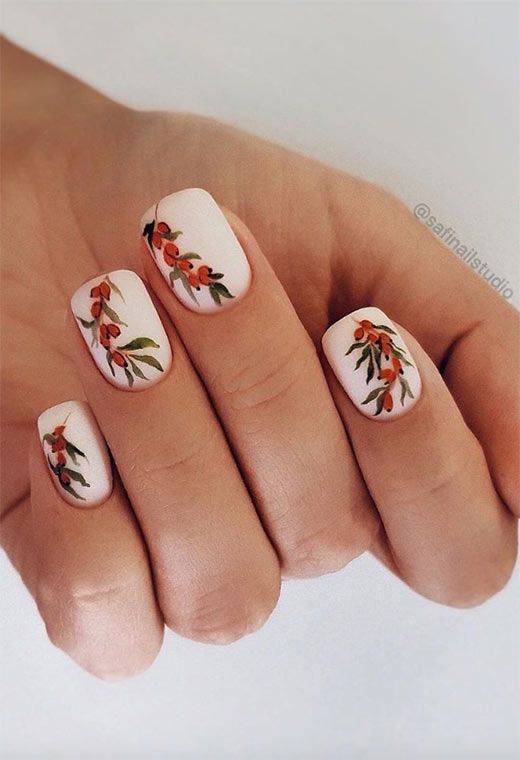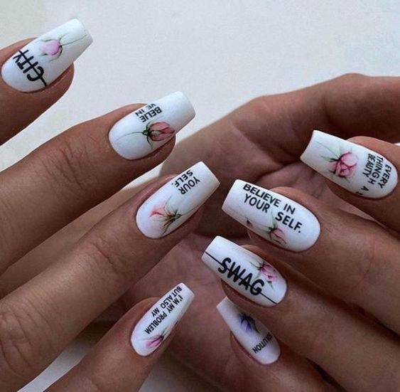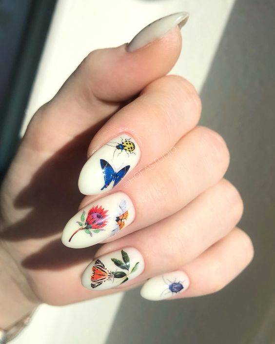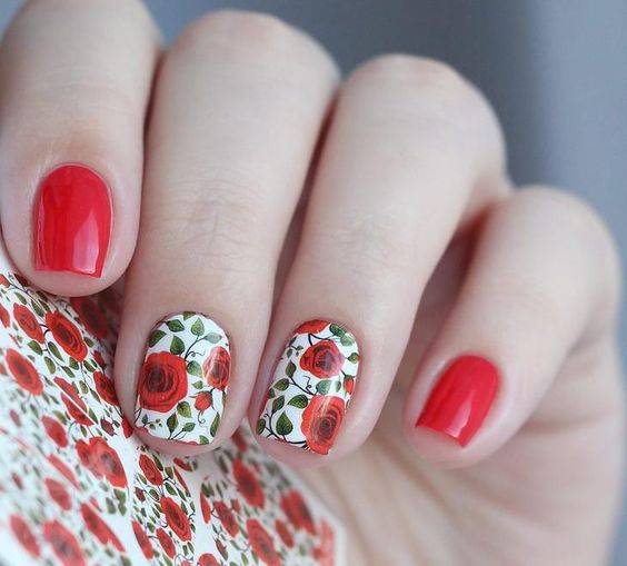 Нейл-арт с полупрозрачными слайдерами напоминает акварельную роспись, что очень модно в текущем сезоне. Лучше подобрать неяркие, нежные наклейки с флористической тематикой, которые смотрятся довольно реалистично.
