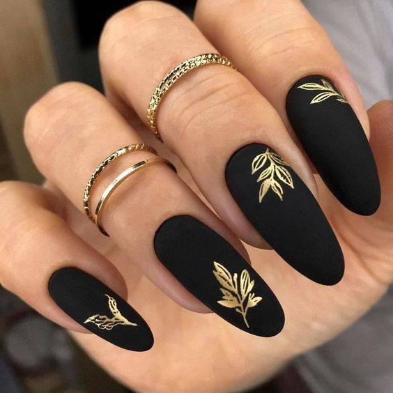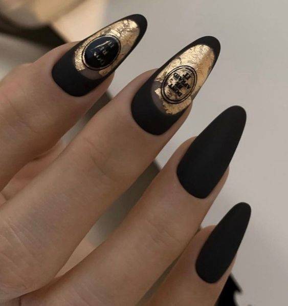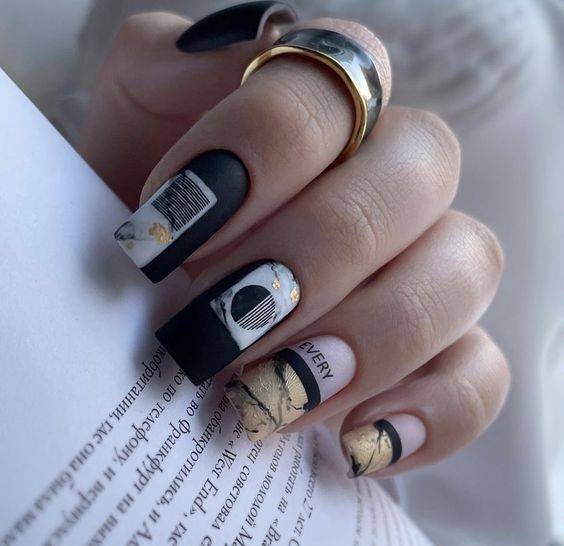 Бархатистое покрытие само по себе считается эффектным и стильным, а в сочетании с слайдер-дизайном становится настоящей модной изюминкой. Чтобы сделать маникюр для праздника, Нового года, можно выполнить его в бело-черной гамме и украсить золотой фольгой.