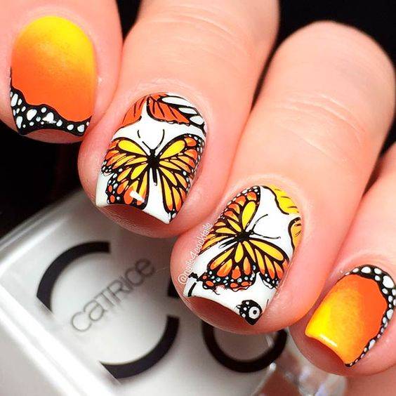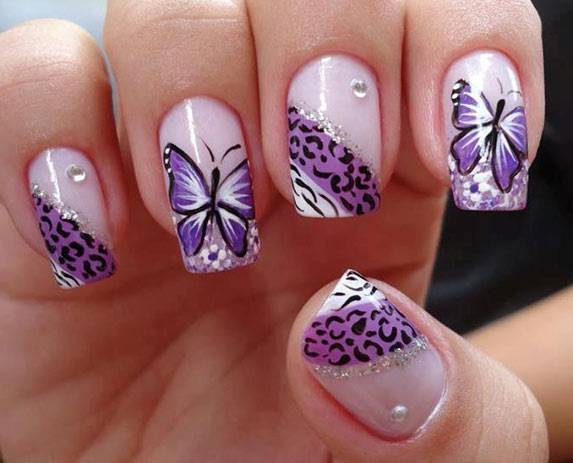 Наклейки-бабочки тоже прекрасно решают задачу сложного нейл-арта, который проблематично исполнить кистью. Они отлично сочетаются с сердечками и цветами, могут быть мелкими или не вмещаться на ноготь полностью. Обычно яркие, броские бабочки служат акцентом на одном ноготке руки.