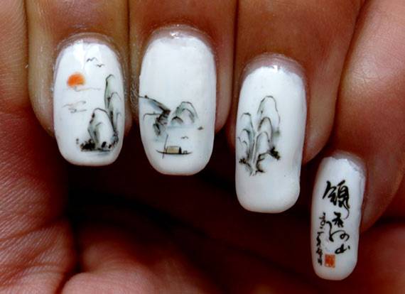 С помощью кисточки наносятся любые рисунки — цветочки, геометрические узоры, иероглифы, пейзажи, в общем, все, что вашей душе угодно. Но здесь потребуется определенная сноровка и художественные способности.