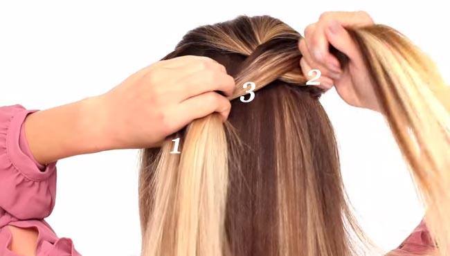 - Взять немного волос над лобной частью, и разделить их на три равноценные пряди. Прядь слева перекрестить с центральной, подвести ее с нижней стороны. Также проделать с правой прядью.