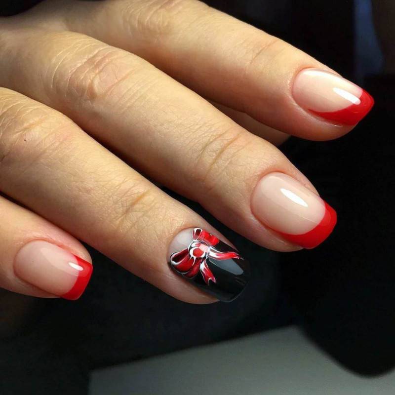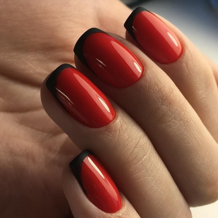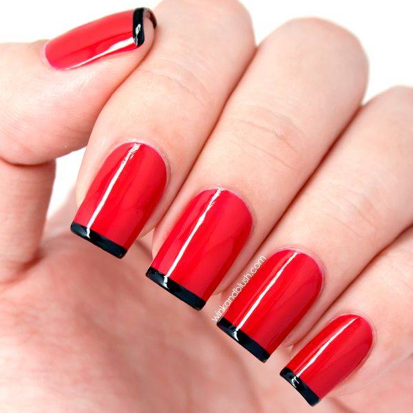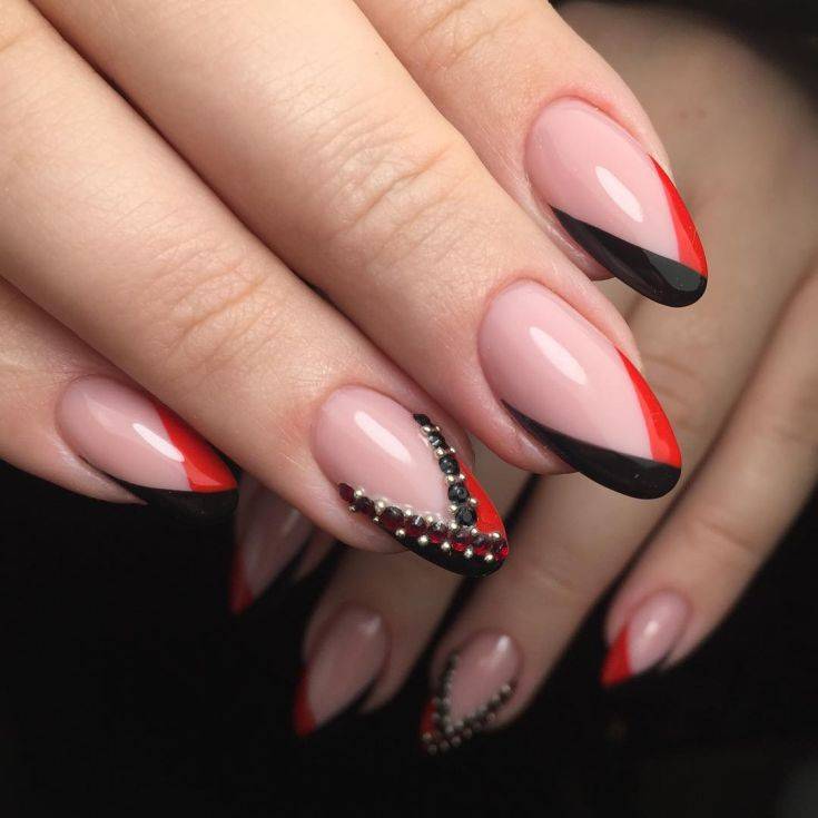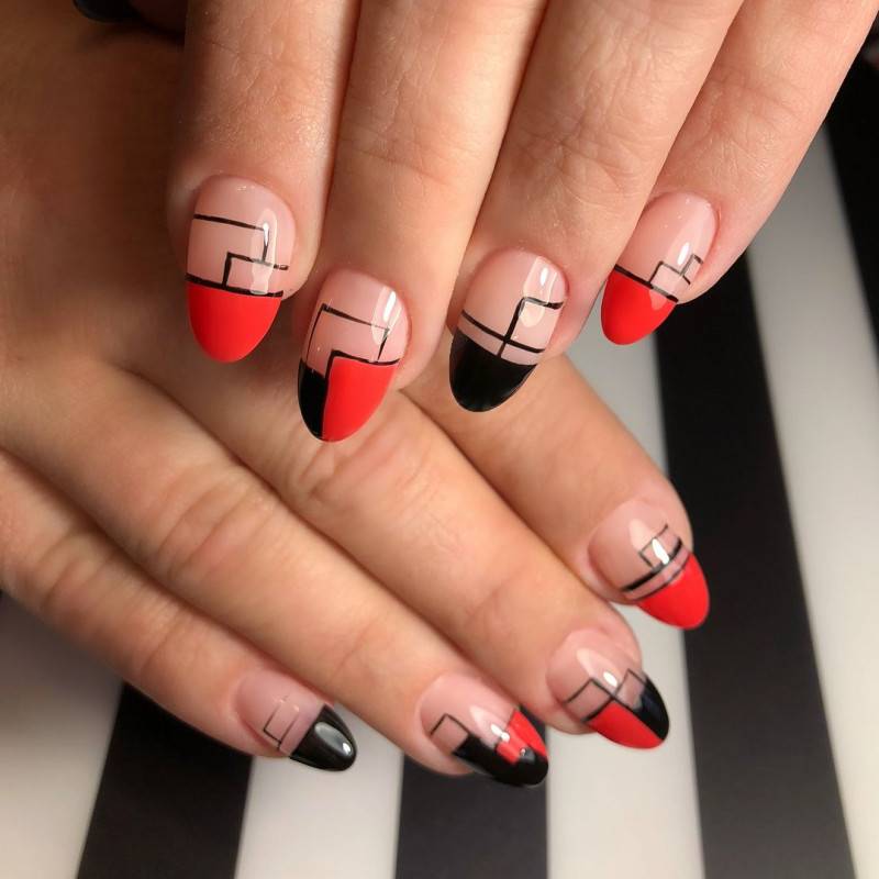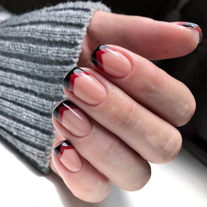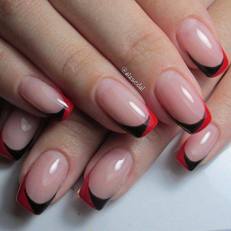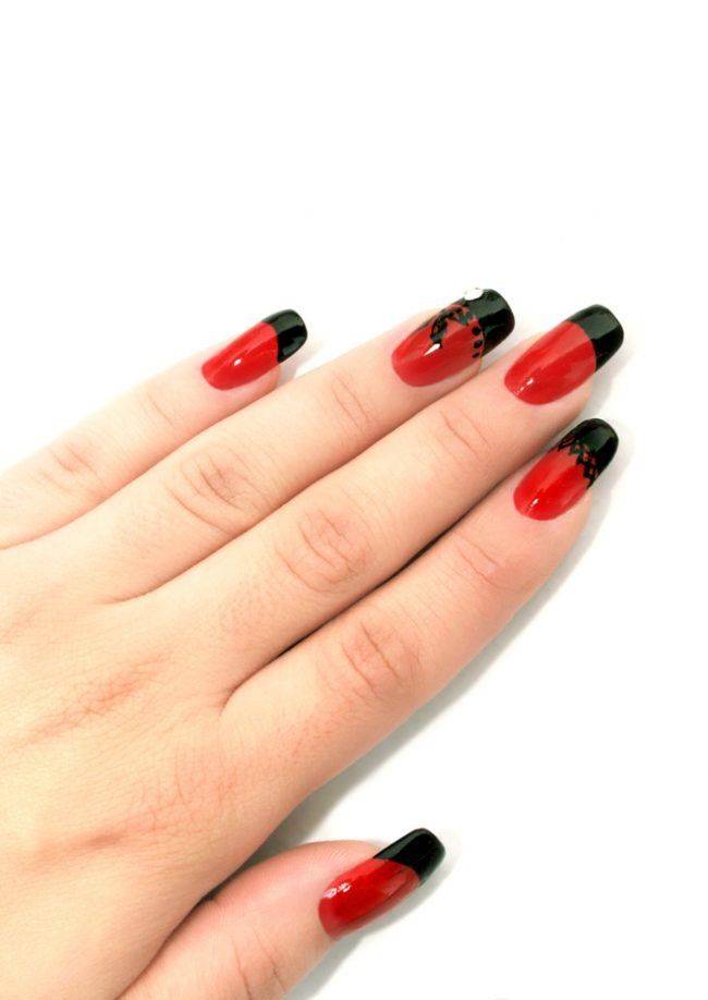 Красный френч с черным – самое смелое цветовое сочетание. Одинаково эффектно смотрится как в варианте с доминирующим красным цветом, так и в случае доминирования черного.