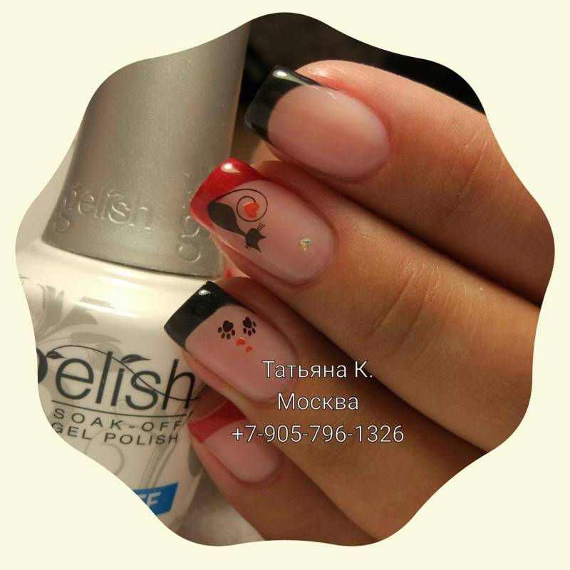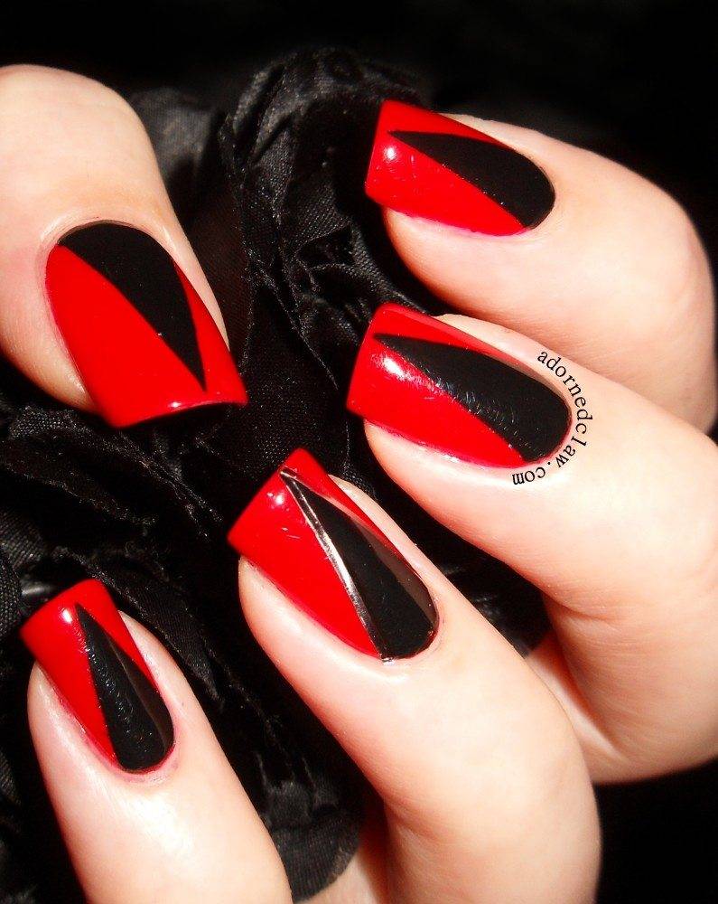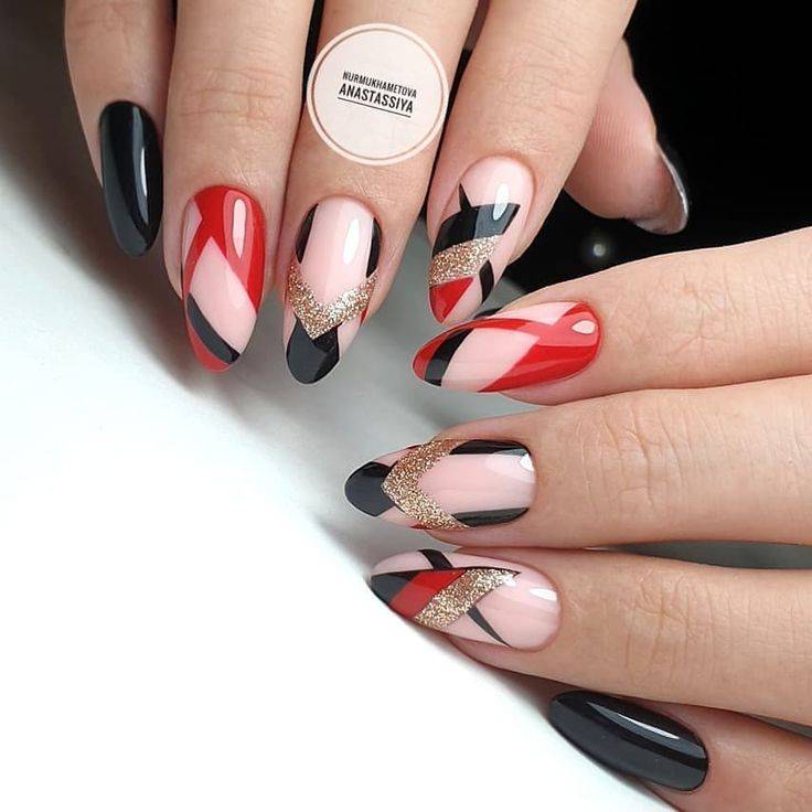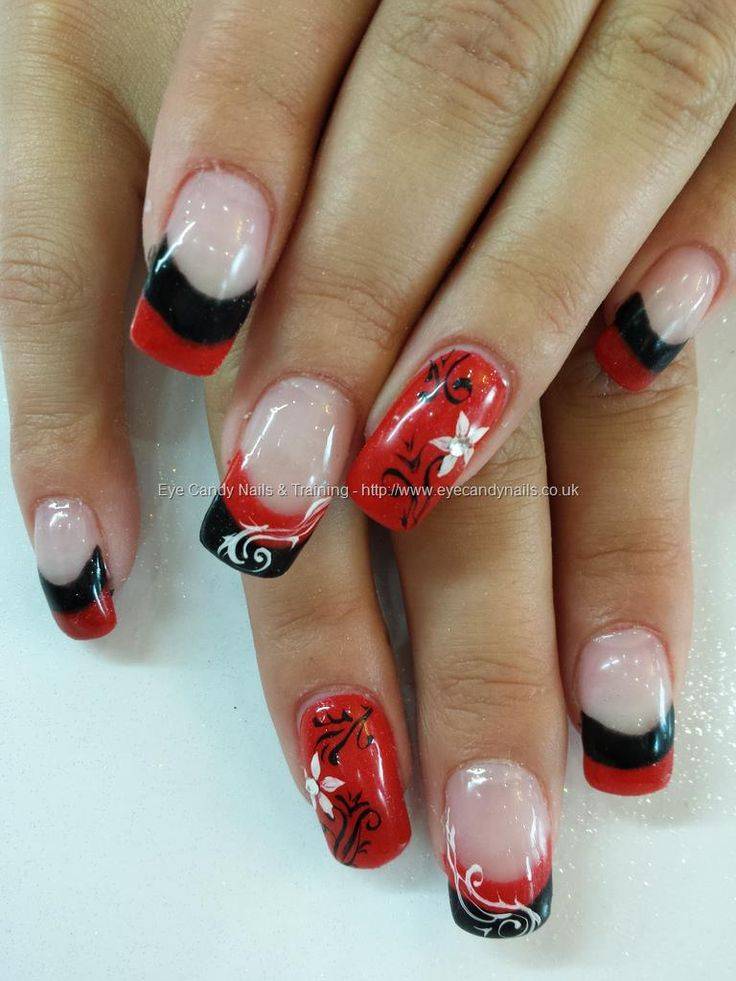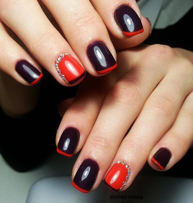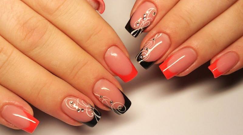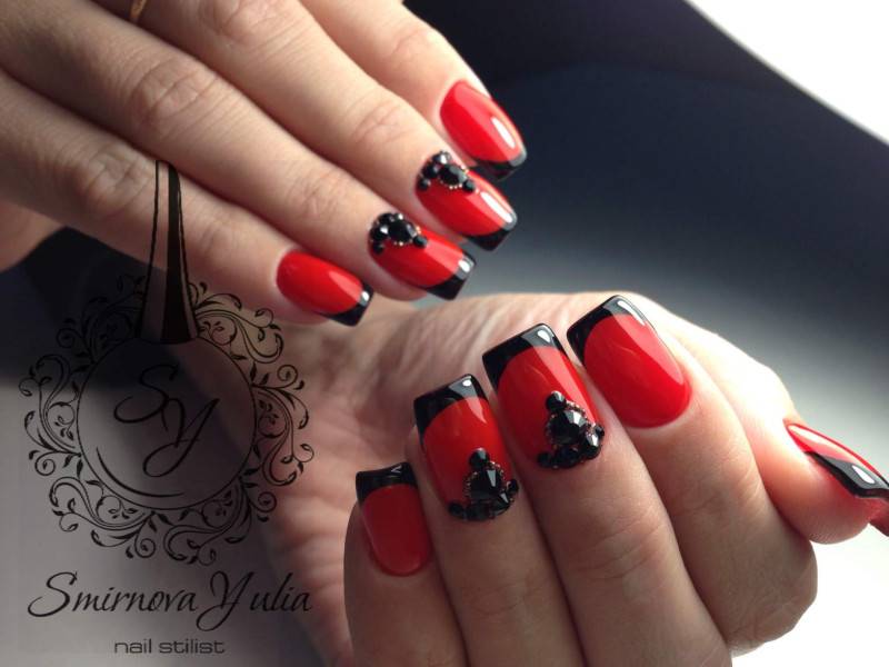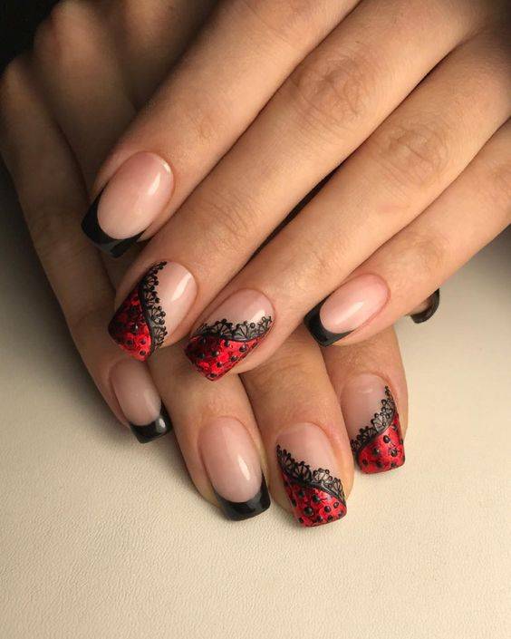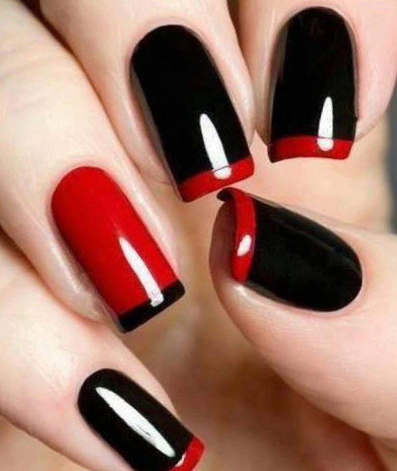 Красный френч с черным – самое смелое цветовое сочетание. Одинаково эффектно смотрится как в варианте с доминирующим красным цветом, так и в случае доминирования черного.