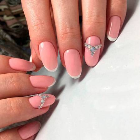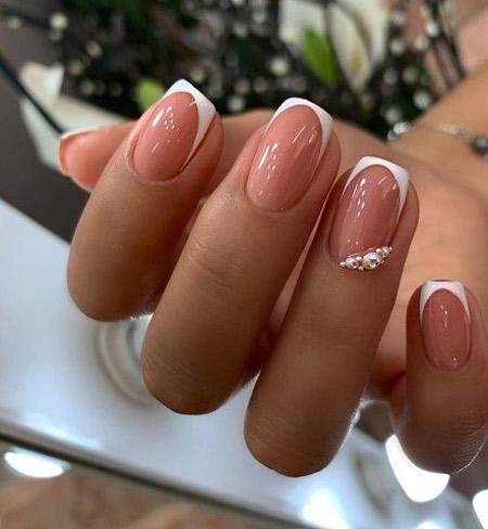 Французский маникюр с камнями может быть выполнен в любом сочетании оттенков, но особое внимание все же стоит уделить элегантному классическому варианту. Нюдовая, прозрачная, нежно-розовая или бледно-персиковая база с белоснежным кончиком сама по себе выглядит очень женственно и элегантно, а блестящие детали в виде оригинальных узоров сделают дизайн еще более изысканным в 2024 году