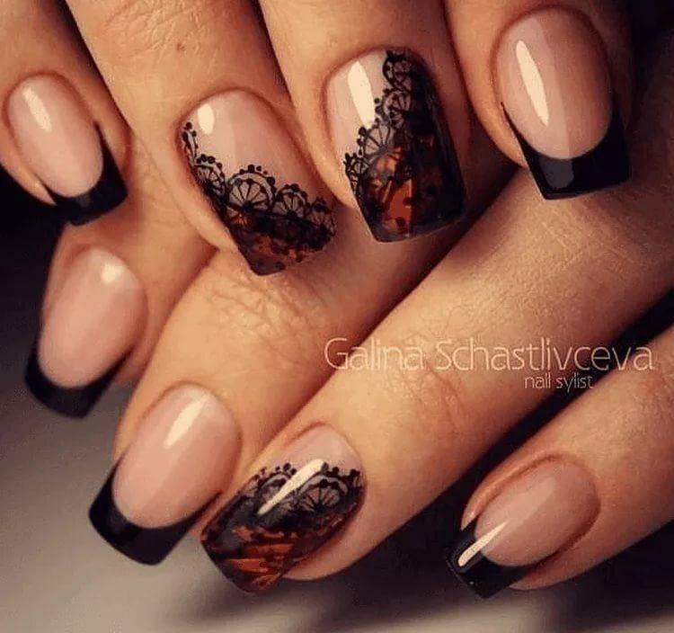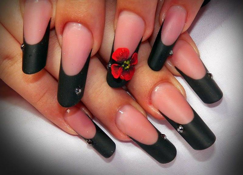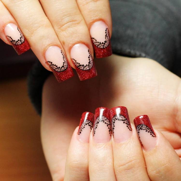 Существует невероятное количество различных идей выполнения французского маникюра, ведь в каждом сезоне мастера предлагают новые идеи, чтоб девушки выбирали для себя прекрасные дизайны. В настоящее время невероятно возвысился интерес к обратному французскому маникюру, особенно если улыбочку сделать черным цветом, а остальную часть покрыть красным тоном. В качестве дополнения используйте нежное кружево или любые рисунки. Еще одна стильная идея выполнения французского маникюра в сочетании данных цветов – сногсшибательное негативное пространство. При выполнении такого маникюра основа ноготка выполняется красным цветом, а не закрашенное пространство можно оставить снизу или сверху ногтевой пластины. Прозрачную зону можно украсить черными рисунками или выделить линиями с обеих сторон.