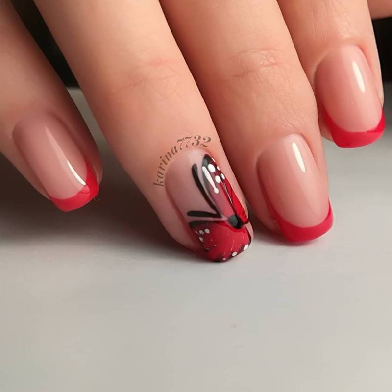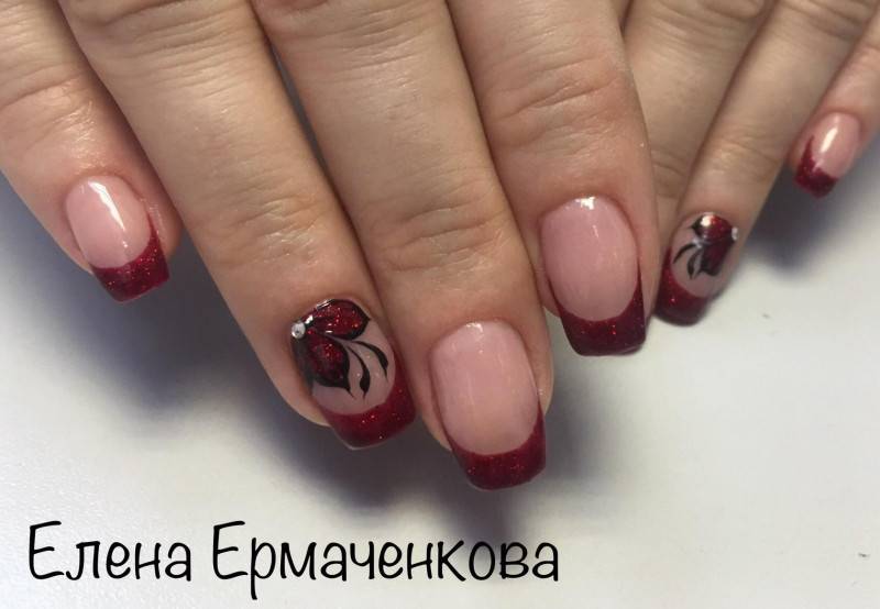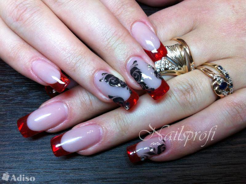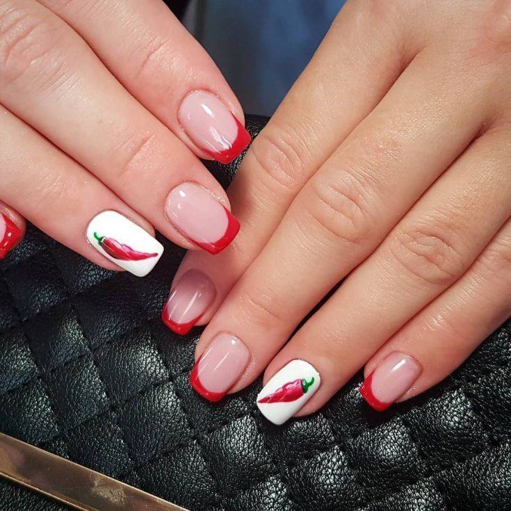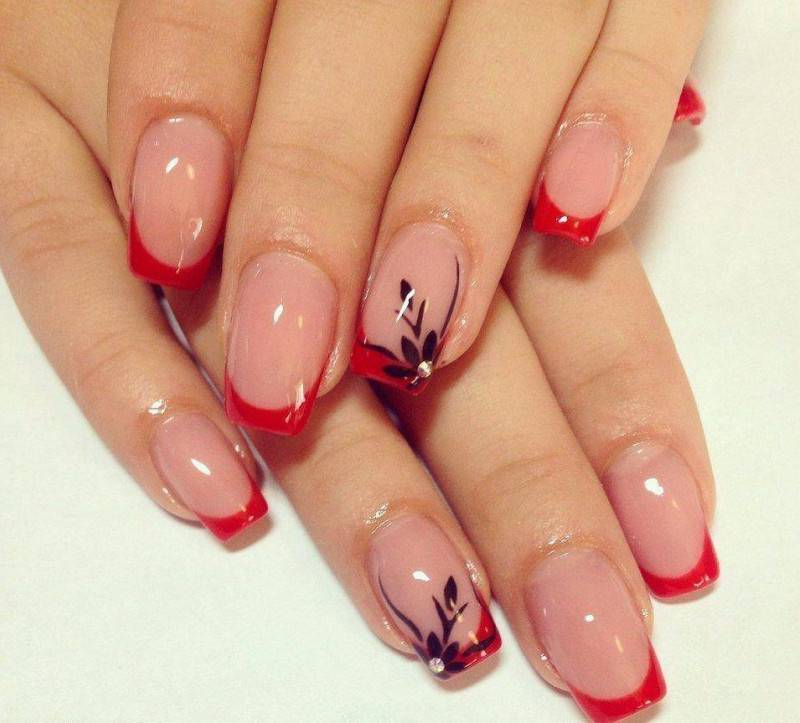 Довольно смелый цвет, который способна себе позволить не каждая женщина. Не стоит его бояться, ведь френч выглядит очень нежно, особенно в сочетании с рисунком. Оттенков красного цвета невообразимо много, можно поиграть с яркой гаммой, чтобы быть замеченной окружающими.