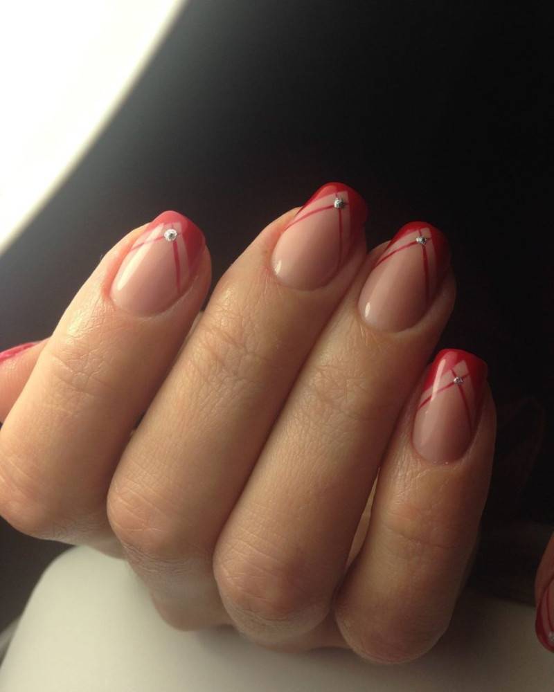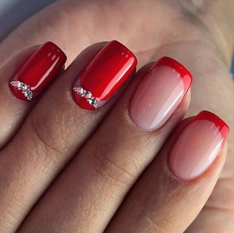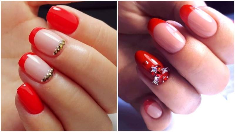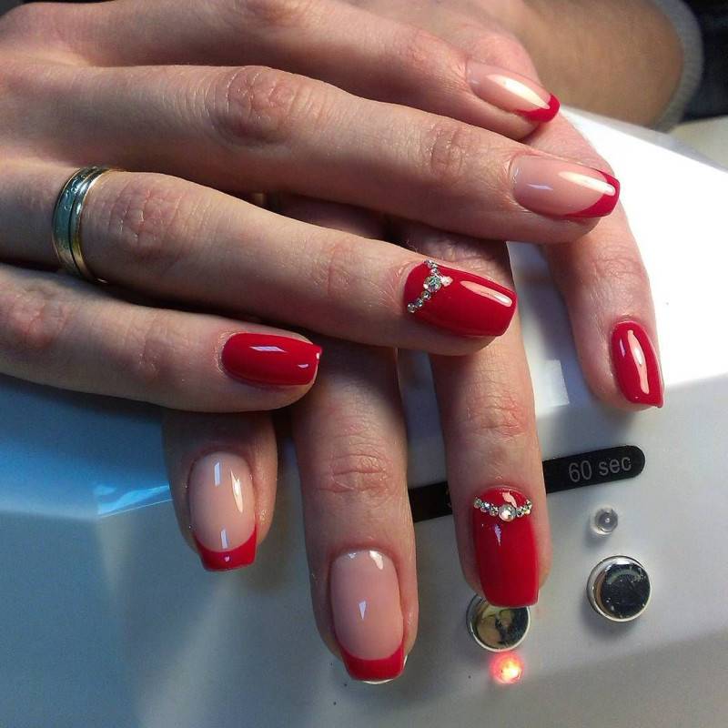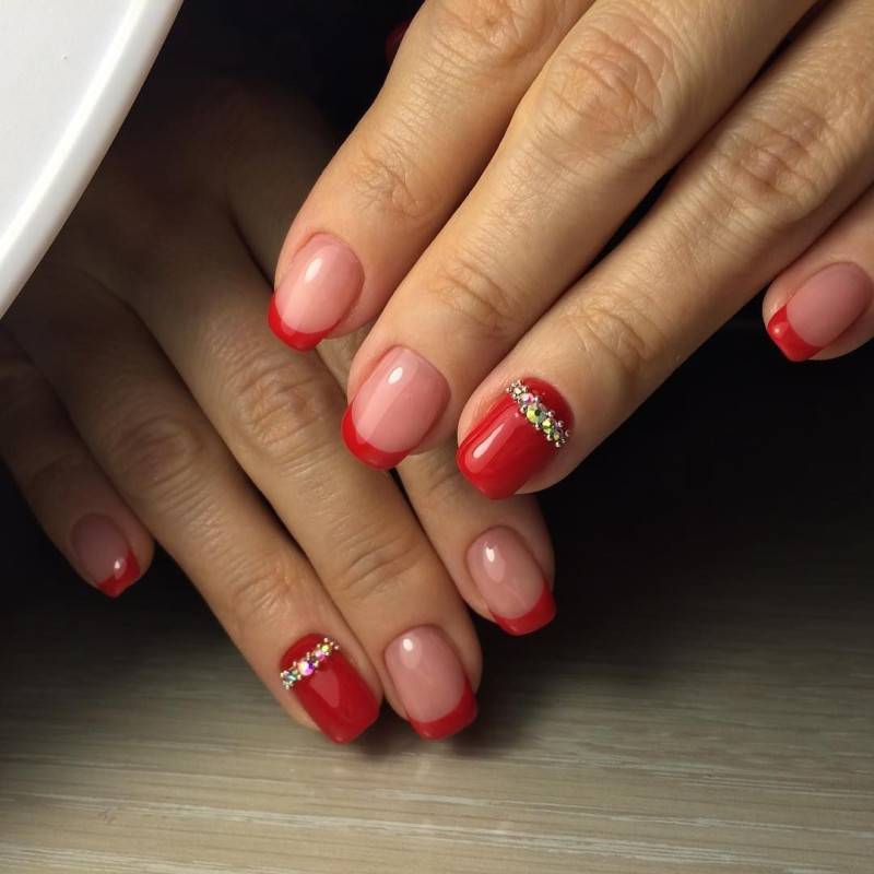 Сегодня ни один маникюр не обходится без красивого дополнения в виде страз. Красный френч не стал исключением. Использовать стразы можно как на всех ноготках, так и на акцентных пальчиках. Красный френч в сочетании со стразами выглядит дорого и фешенебельно. Стразы можно нанести россыпью по всей ногтевой пластине, а можно использовать их точечно. Например, в виде пирамиды у основания ногтя.