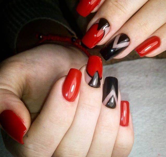 А вот геометрические детали в маникюре френч с использованием черно-красного колора, напротив, добавят остроты образу.