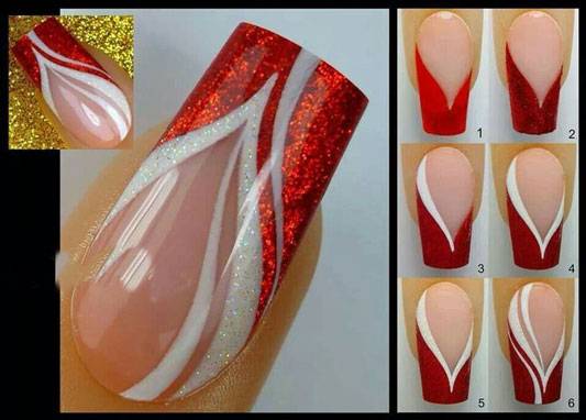 Однако сочетание белого с красным довольно опасный вариант и требует учета ряда нюансов, таких как длина и форма ногтевой пластины. Так излишек белого цвета на широких и коротких ногтях сделает их через-чур короткими и еще больше визуально расширит их. Усиление роли красных оттенков, напротив, позволит сгладить несовершенства и погрешности маникюра.