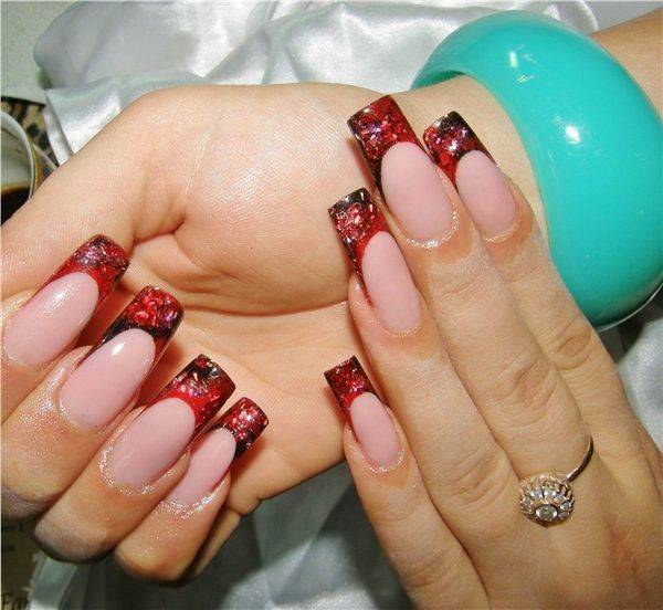 - пайетки. Пайетки точно станут трендом предстоящего сезона, особенно стильно будет смотреться выкладка красными пайетками на основе ногтевой пластины. Такой маникюр создаст праздничный вид и оригинальное исполнение привычного французского маникюра;