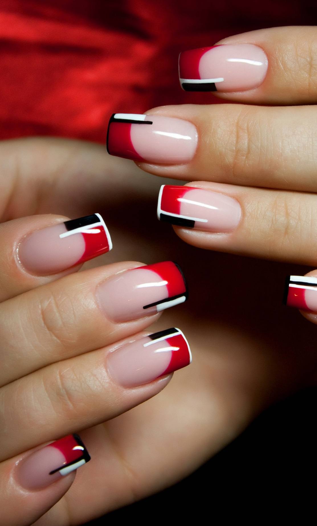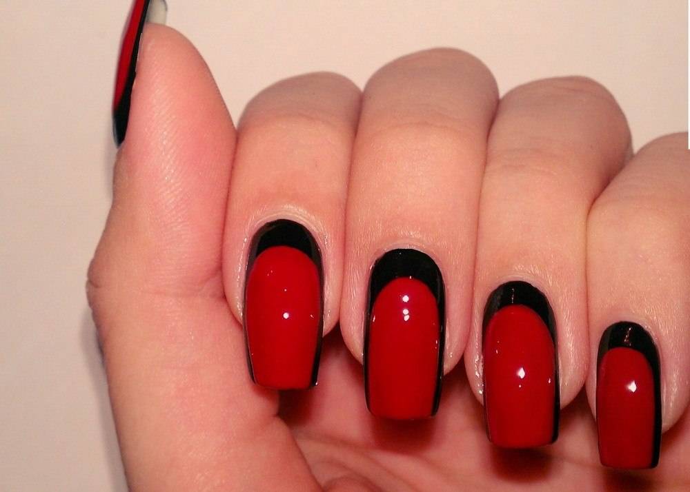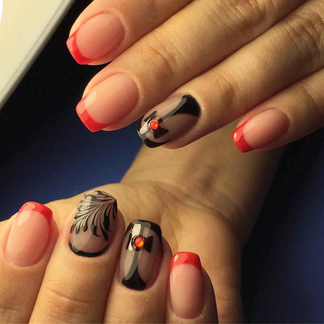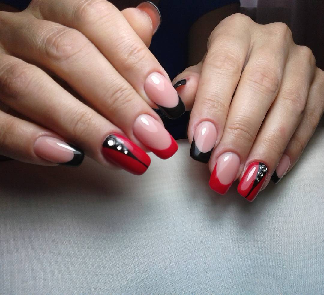 Красный френч с черным – самое смелое цветовое сочетание. Одинаково эффектно смотрится как в варианте с доминирующим красным цветом, так и в случае доминирования черного.