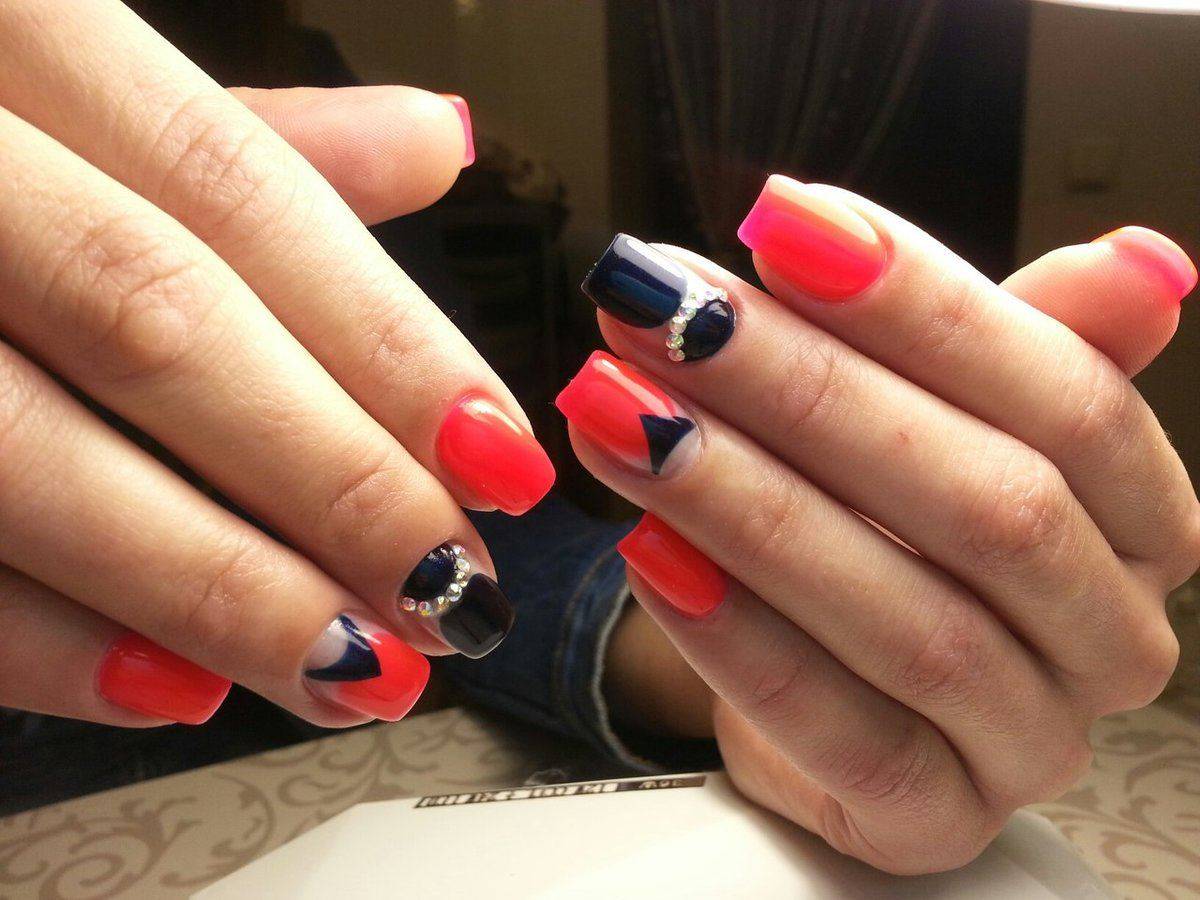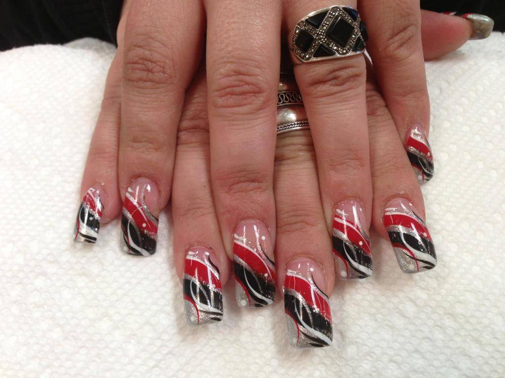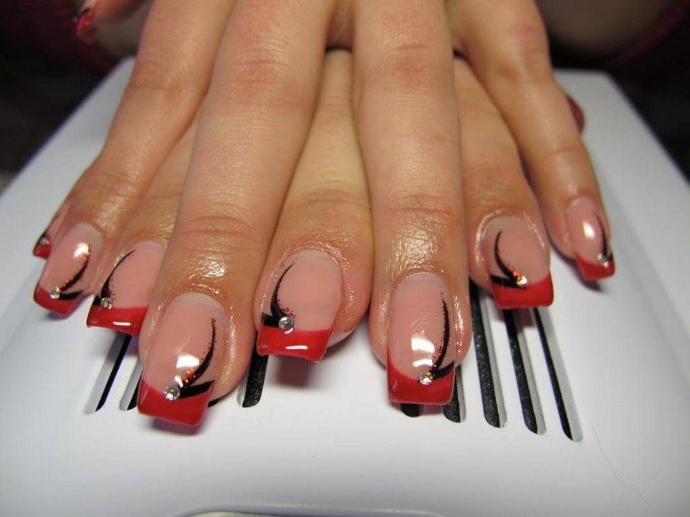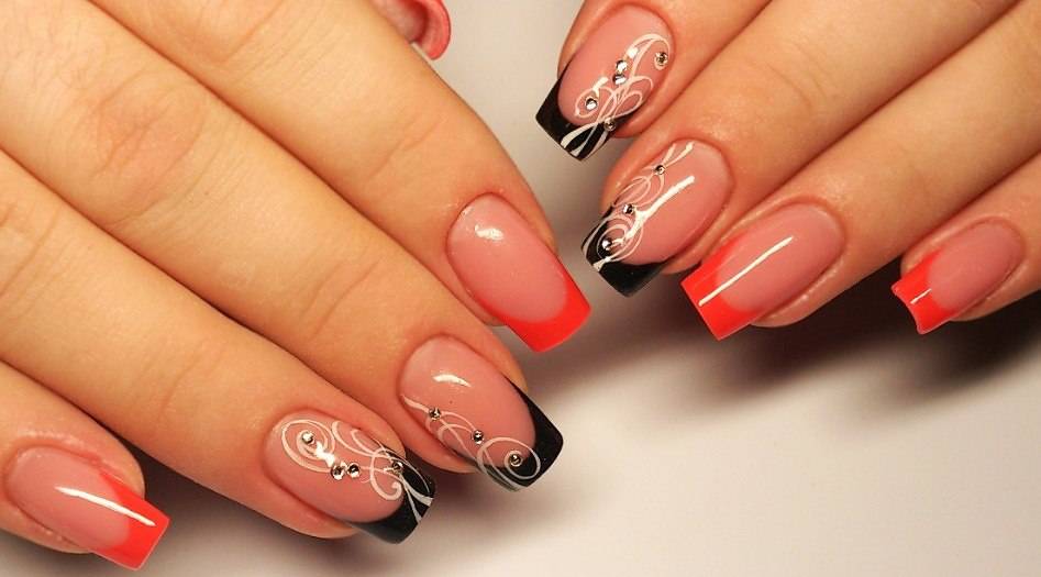 Красный френч с черным – самое смелое цветовое сочетание. Одинаково эффектно смотрится как в варианте с доминирующим красным цветом, так и в случае доминирования черного.
