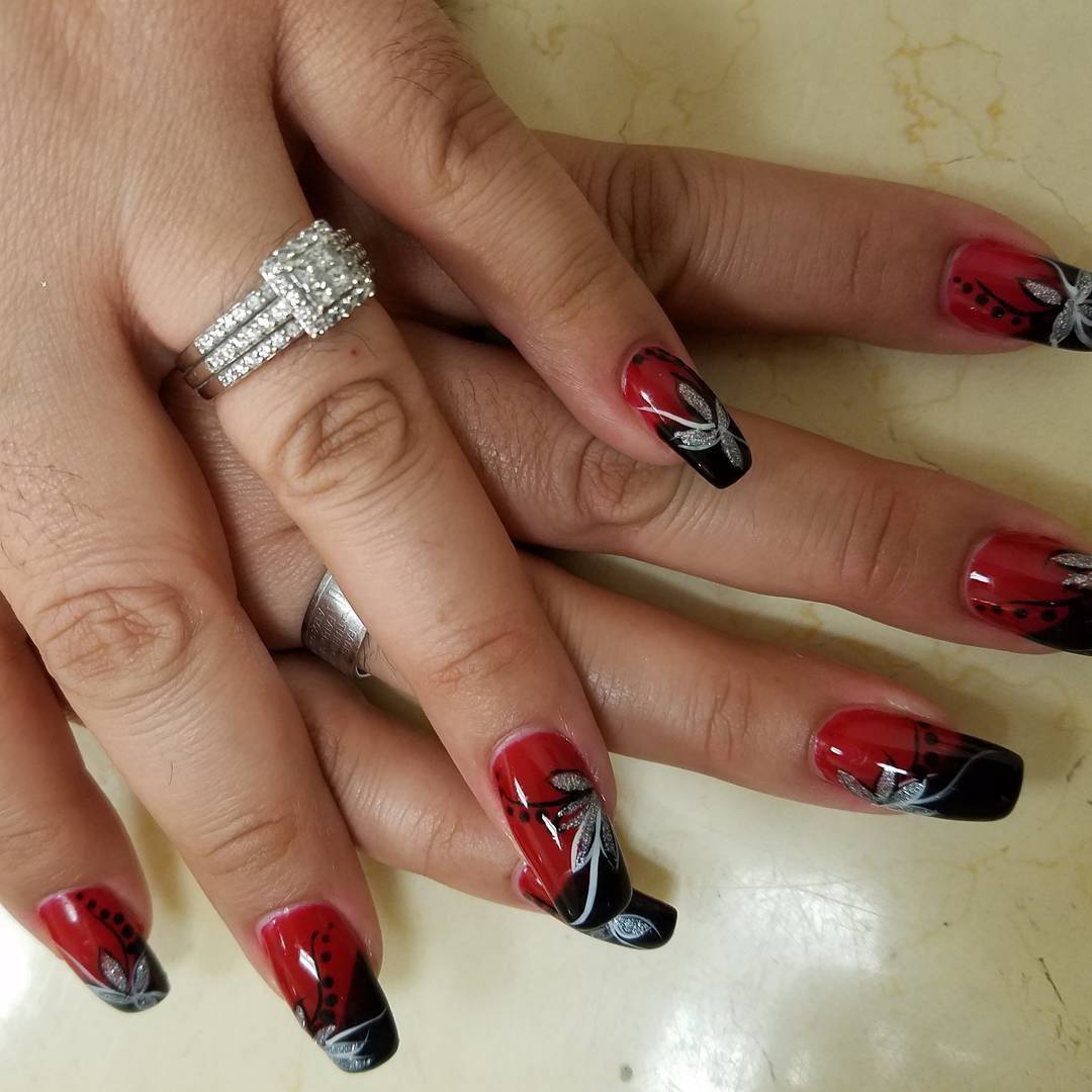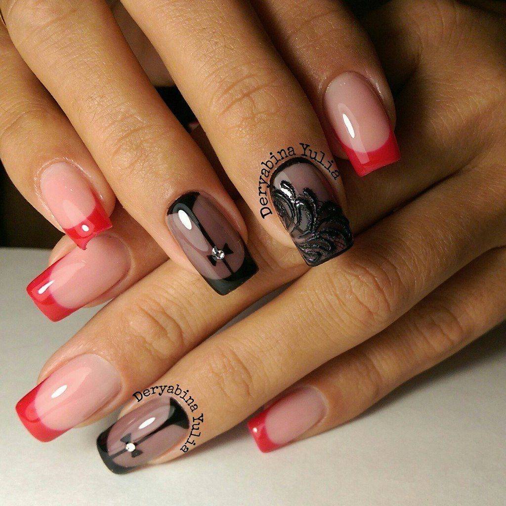 Существует невероятное количество различных идей выполнения французского маникюра, ведь в каждом сезоне мастера предлагают новые идеи, чтоб девушки выбирали для себя прекрасные дизайны. В настоящее время невероятно возвысился интерес к обратному французскому маникюру, особенно если улыбочку сделать черным цветом, а остальную часть покрыть красным тоном. В качестве дополнения используйте нежное кружево или любые рисунки. Еще одна стильная идея выполнения французского маникюра в сочетании данных цветов – сногсшибательное негативное пространство. При выполнении такого маникюра основа ноготка выполняется красным цветом, а не закрашенное пространство можно оставить снизу или сверху ногтевой пластины. Прозрачную зону можно украсить черными рисунками или выделить линиями с обеих сторон.