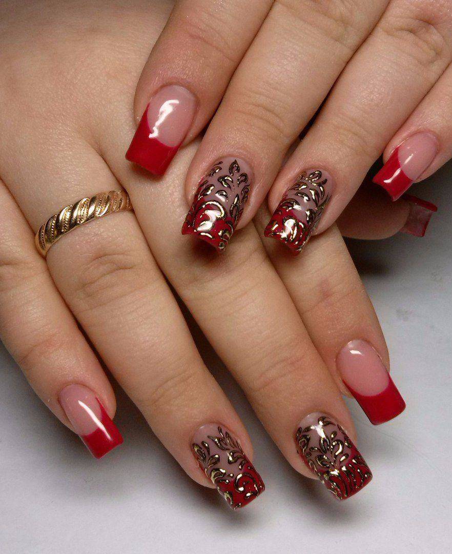 Неплохо красный френч смотрится и как самостоятельный цвет на золотом фоне, либо напротив – золотистые полосы на красном фоне.