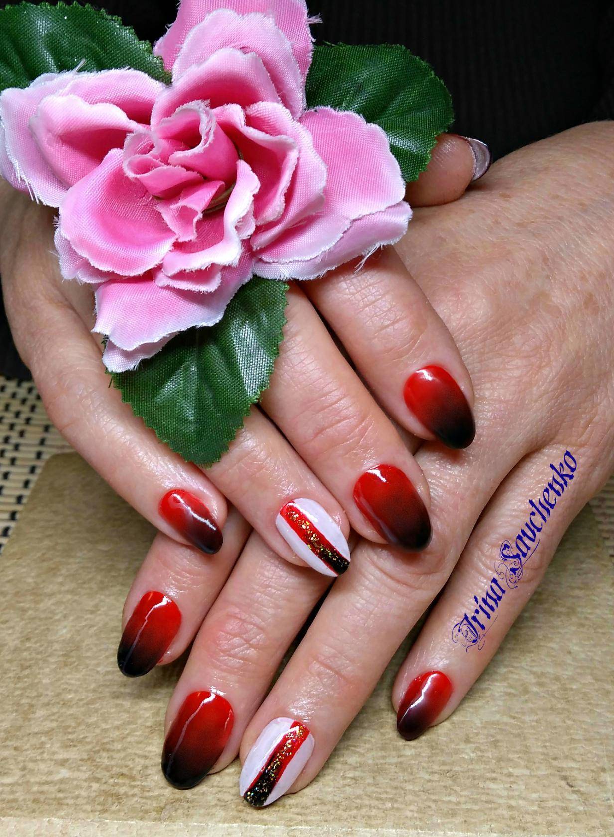 Однако сочетание белого с красным довольно опасный вариант и требует учета ряда нюансов, таких как длина и форма ногтевой пластины. Так излишек белого цвета на широких и коротких ногтях сделает их через-чур короткими и еще больше визуально расширит их. Усиление роли красных оттенков, напротив, позволит сгладить несовершенства и погрешности маникюра.