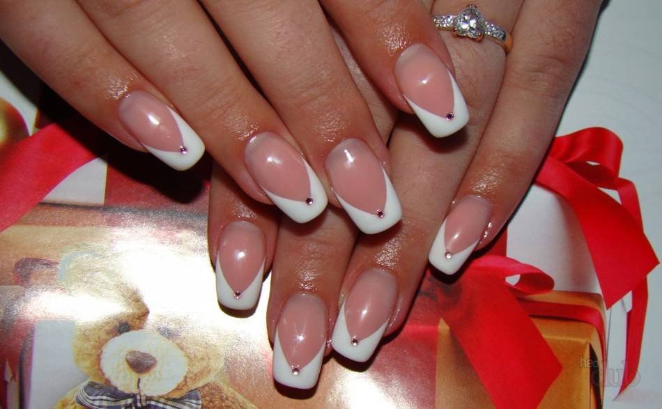 Самый нежный французский маникюр получается при использовании классической комбинации оттенков – белого с телесным или светло-розовым. Стильные белые кончики придадут ногтевым пластинам изящность и привлекательность.
