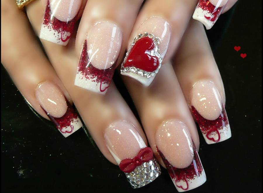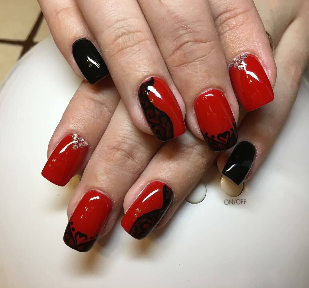 Ещё несколько вариантов красно-белого оформления – романтическое с сердечками и капельками страз, с чёрной геометрической композицией на белоснежном фоне, роскошными россыпями страз, лаконичным лунным маникюром и перевёрнутым френчем.