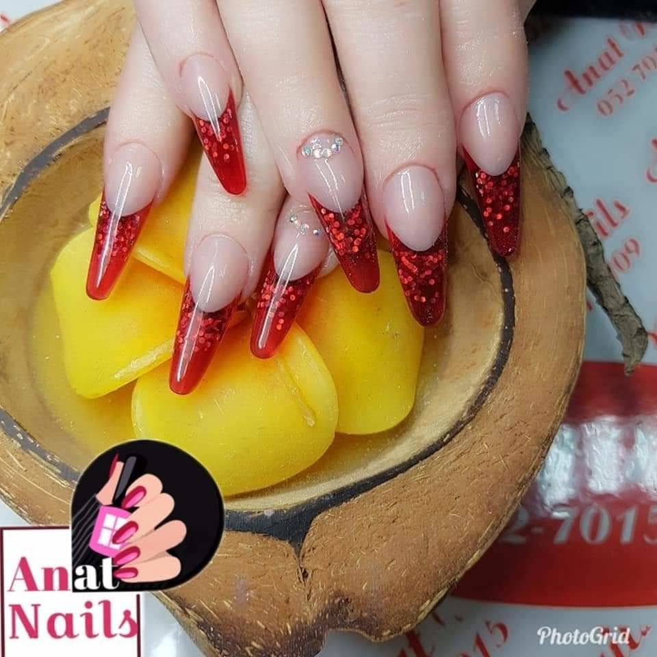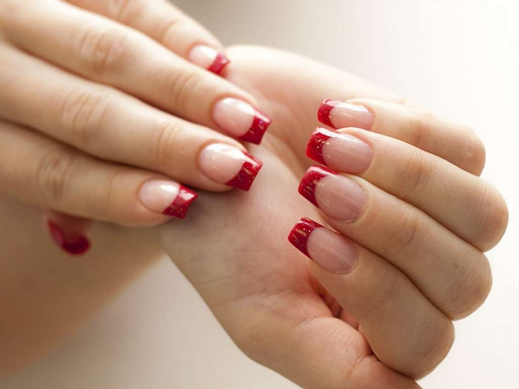 - блёстки. Использование красных блёсток придаст маникюру более праздничный внешний вид. Поскольку объёмные бусины — не тренд сезона, их стоит заменить на мелкие блёстки и втирки. Актуальным является нанесение блёсток под основание пластины, то есть под шиммер или гель-лак. Подобное решение создаст интересное мерцание ногтя, позволит разнообразить идею классического френча;