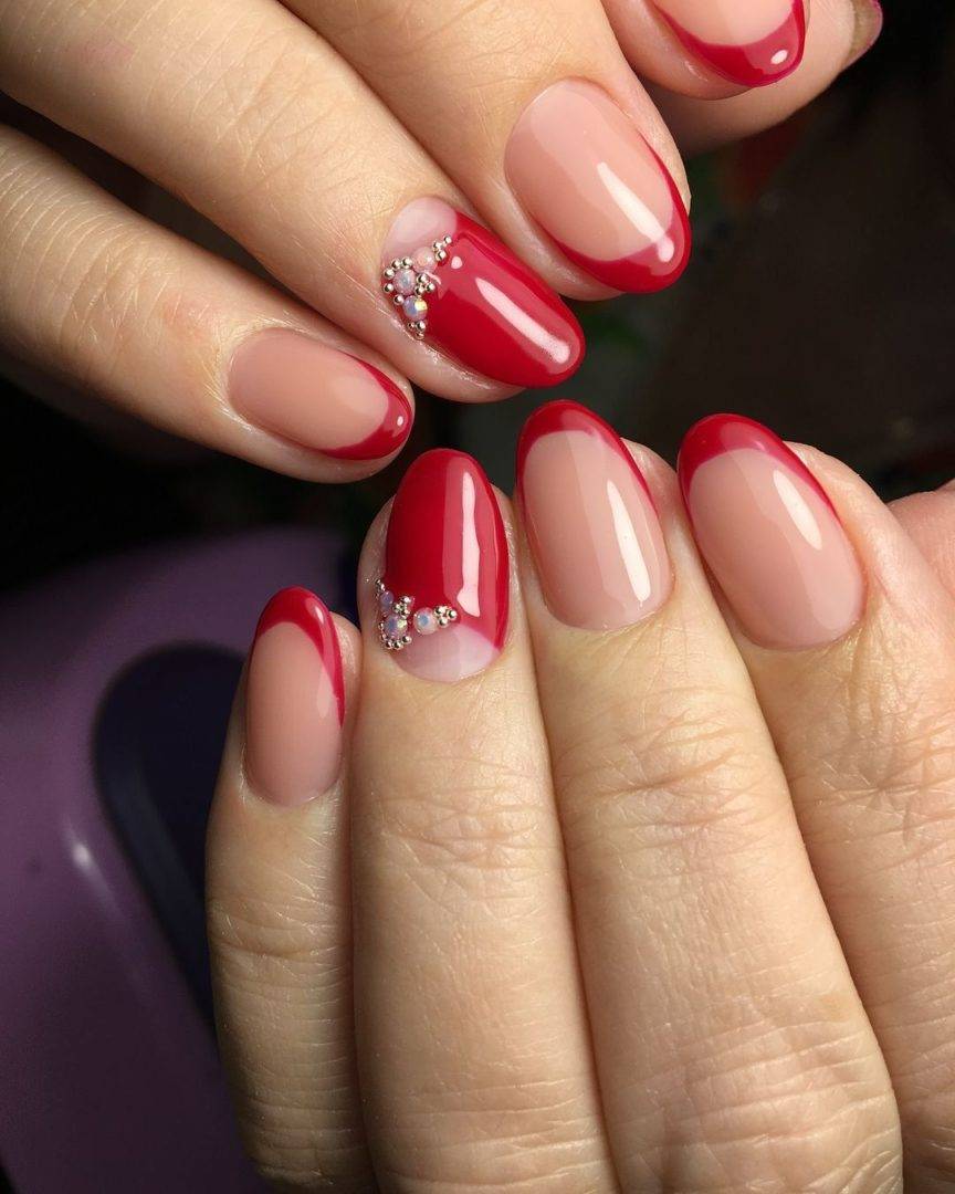Сегодня ни один маникюр не обходится без красивого дополнения в виде страз. Красный френч не стал исключением. Использовать стразы можно как на всех ноготках, так и на акцентных пальчиках. Красный френч в сочетании со стразами выглядит дорого и фешенебельно. Стразы можно нанести россыпью по всей ногтевой пластине, а можно использовать их точечно. Например, в виде пирамиды у основания ногтя.