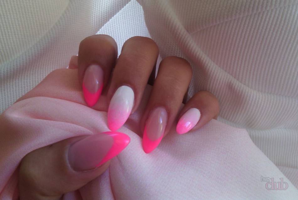Как выглядит френч, в котором линия улыбки выполнена двумя оттенками? Его можно смело назвать дерзким и неизбитым вариантом классического дизайна. Лучше брать контрастные тона, например, любой яркий и пастельный или белый и неоновый.