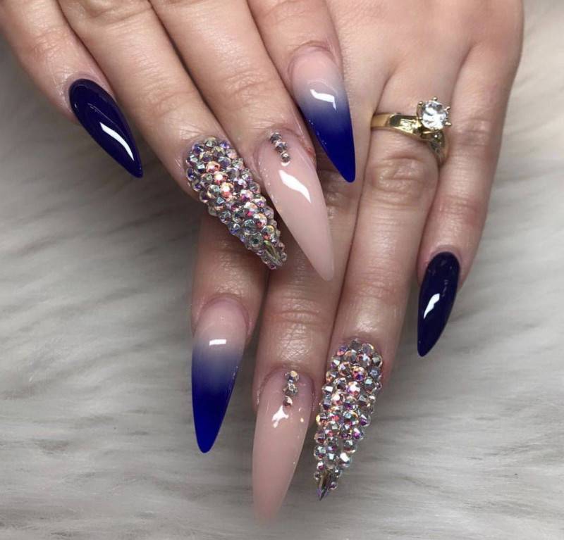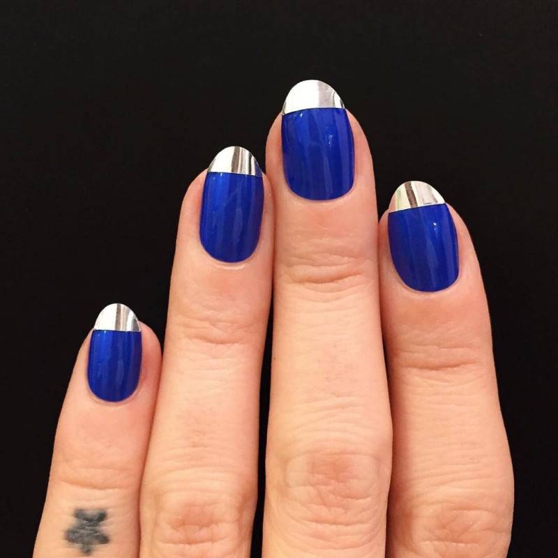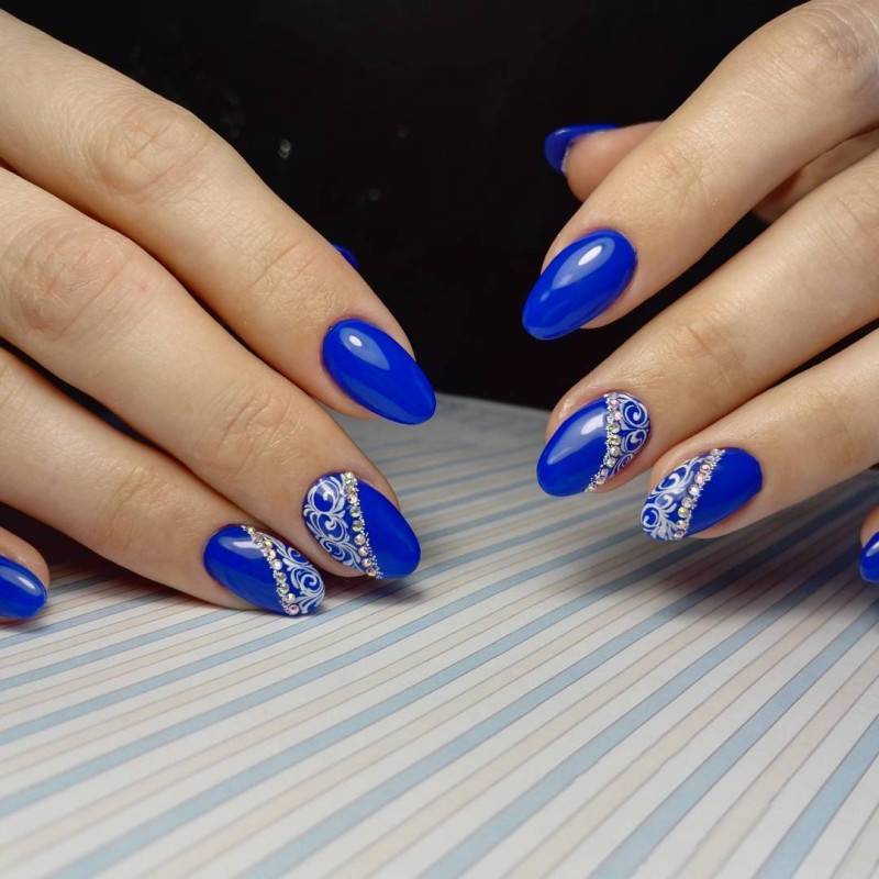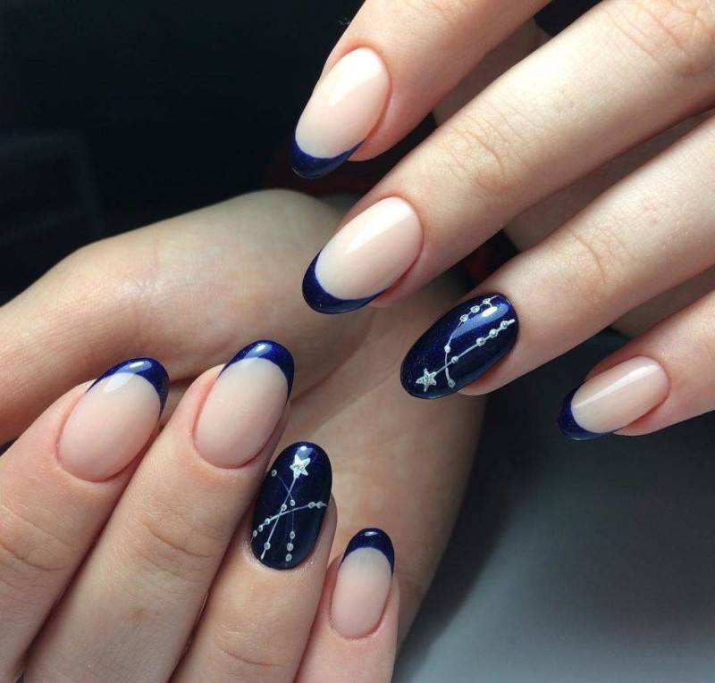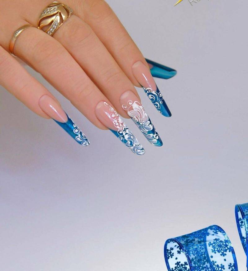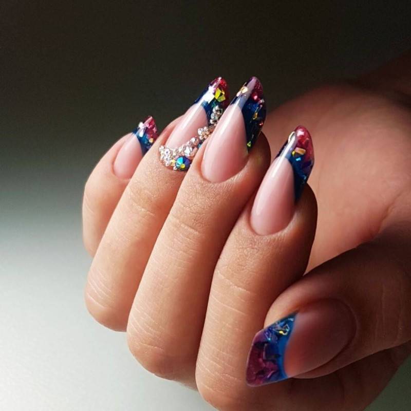 Чтобы почувствовать себя особенной женщиной, мастера маникюра могут предложить вам огромное обилие дизайнерских nаil-решений. Длинные ногти придадут вам стильный и утонченный образ. Для длинных ногтей миндалевидной формы отличным вариантом будет стильный синий френч. Френч из глиттера также смотрится необычно и ярко.