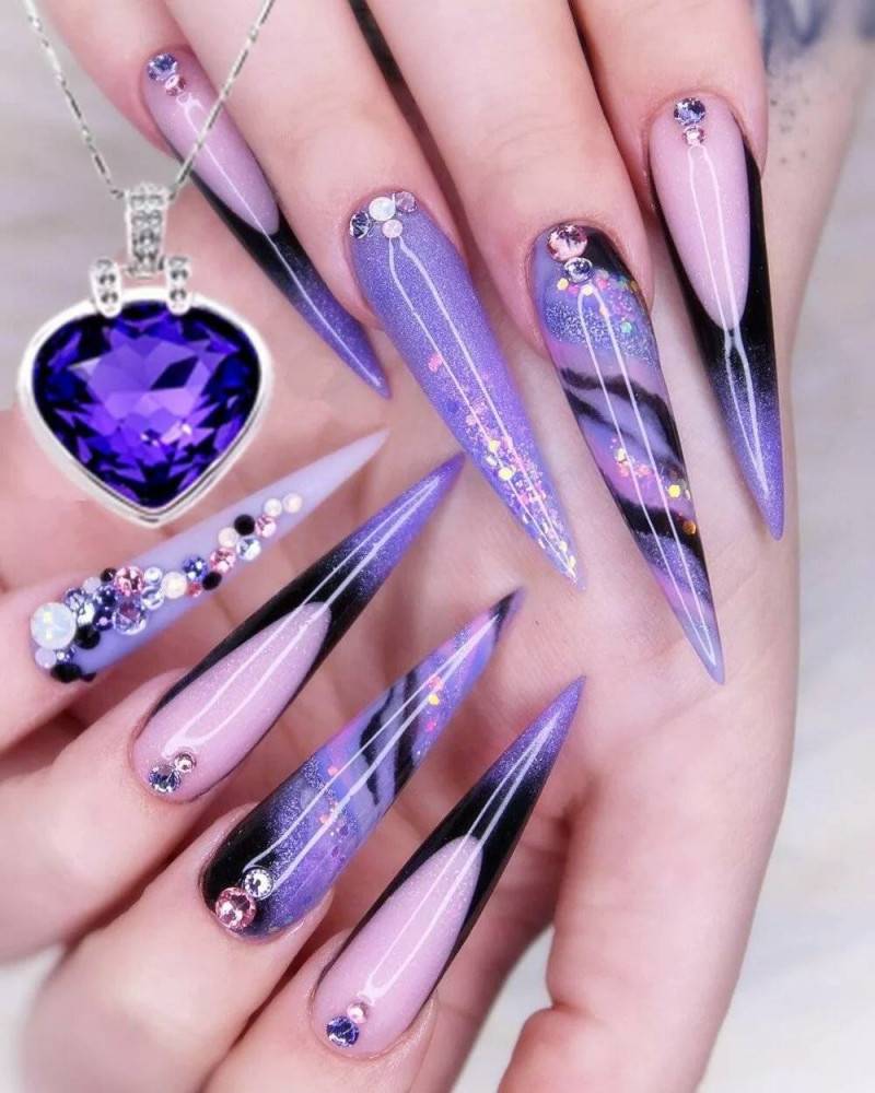 Сиреневый в своем исполнении на короткую длину схож с розовыми тонами. Задача та же, выполнение с различными дизайнами то же, но отличие лишь в том, что это будет не надоедливый розовый, а редкий сиреневый оттенок.