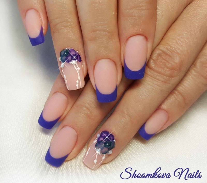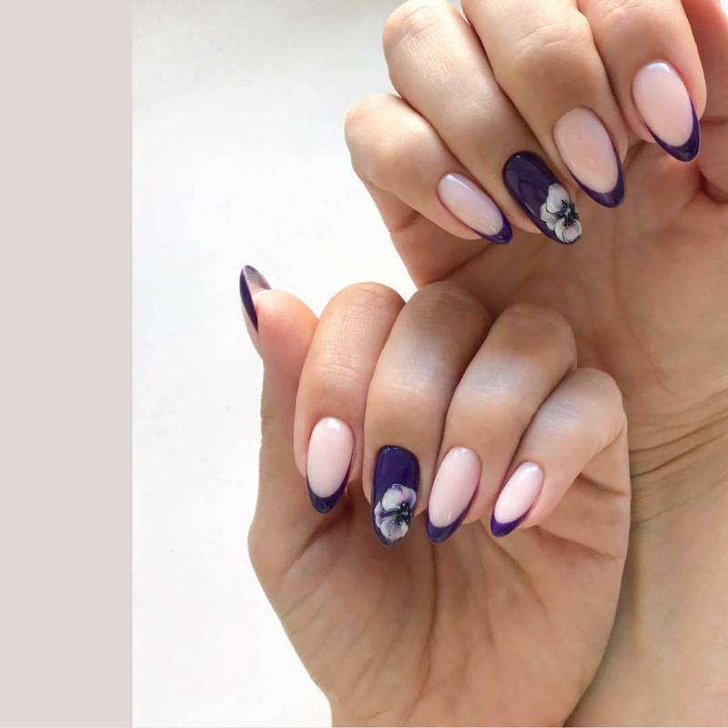 Это сочетание можно было бы назвать классическим, поскольку фиолетовый давно закрепил за собой хорошую славу. Но выбор весьма необычен. Он для тех, кто всегда полон идей. Подсказка — добавьте матовый топ, и более оригинальное трудно будет придумать. Для такого френча нет возрастных ограничений, даже несмотря на оригинальность.