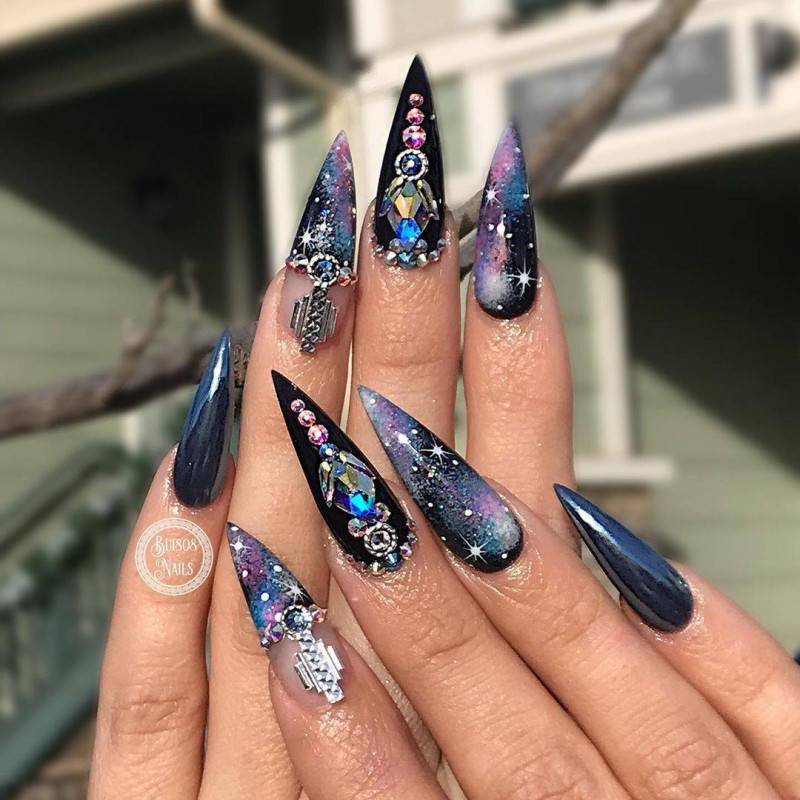 Стразы, как дополнительный элемент декорирования, могут находиться в любом месте на ногте, могут быть размещены в форме какой-либо фигуры, узора, могут размещаться хаотично.