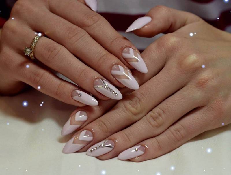 Острые ногти сегодня в тренде и френч идеальное решение для них. Но при такой форме ногтей не следует использовать ядовитые и яркие оттенки, это придаст вульгарности образу. Хорошо будет выглядеть геометрический рисунок на таких ногтях. Дизайнеры советуют простой и женственный вариант – натуральный цвет ногтей с широкой белой улыбкой.