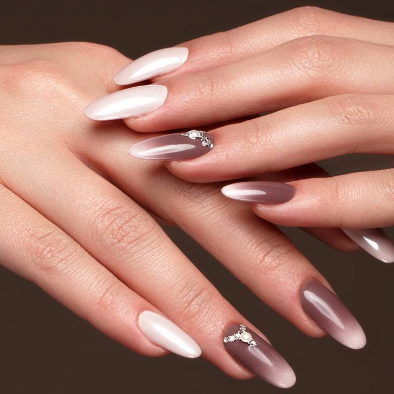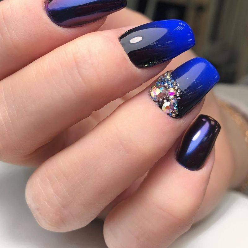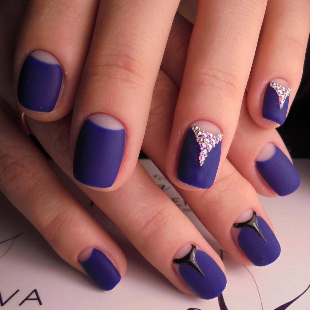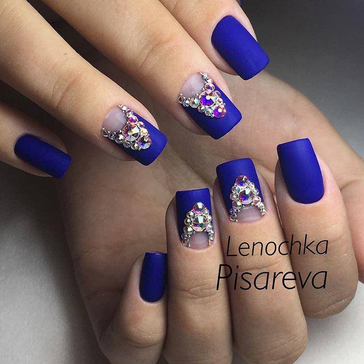 Цветной маникюр в сочетании с фольгой, битое стекло на фоне матового однотонного слоя, орнаментные узоры с акцентами на блестки, лунный дизайн в стиле «фан» и нежное перетекание оттенков в роскошный омбре – все эти варианты нейл-арта уместно декорировать стразами. И такое украшение ноготков позволит их обладательницам оставаться на пике модных веяний.