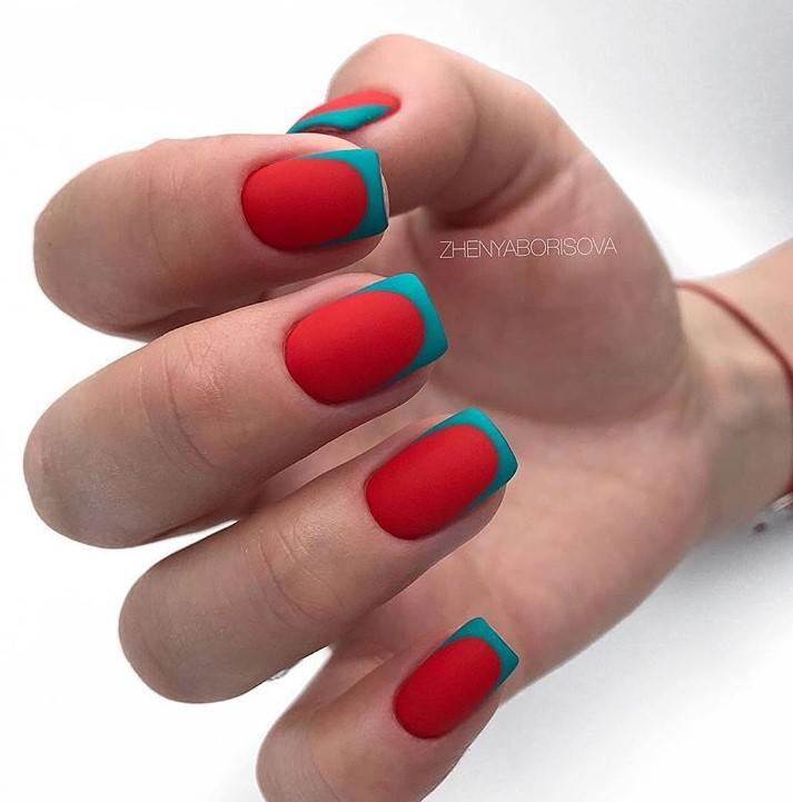 Также цветной френч подразумевает под собой однородный маникюр с изображением на основном цвете самых разных узоров или фигур любого цвета. Также узор может быть нескольких цветов. Может быть несколько типов принтов и так далее.