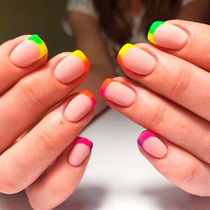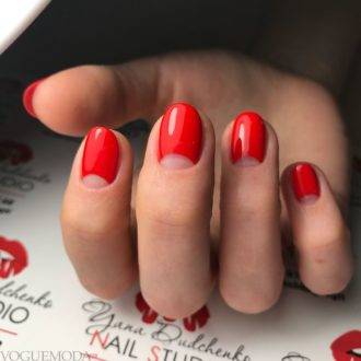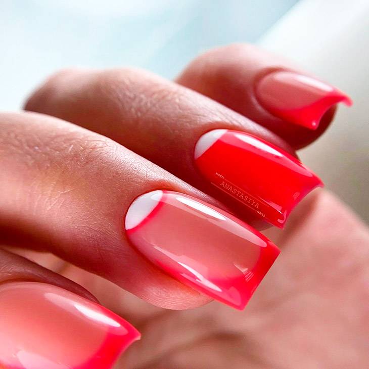Такой маникюр создается рядом не с кончиком, а с кутикулой ногтя. С помощью этого маникюра девушка сможет подчеркнуть контрастность цветов или, наоборот, их мягкий и плавный переход.