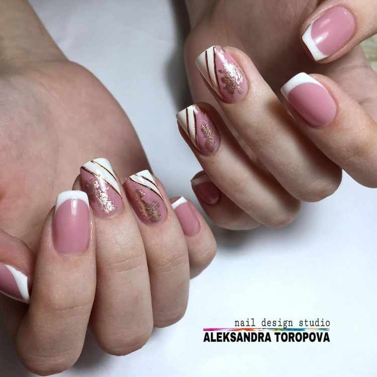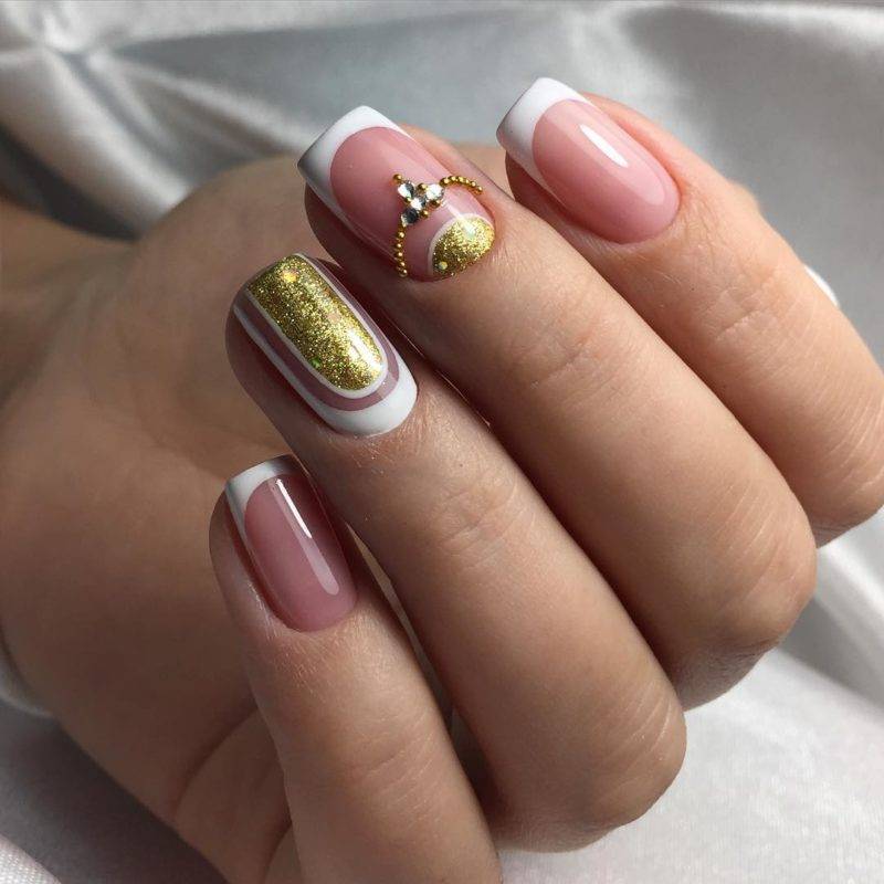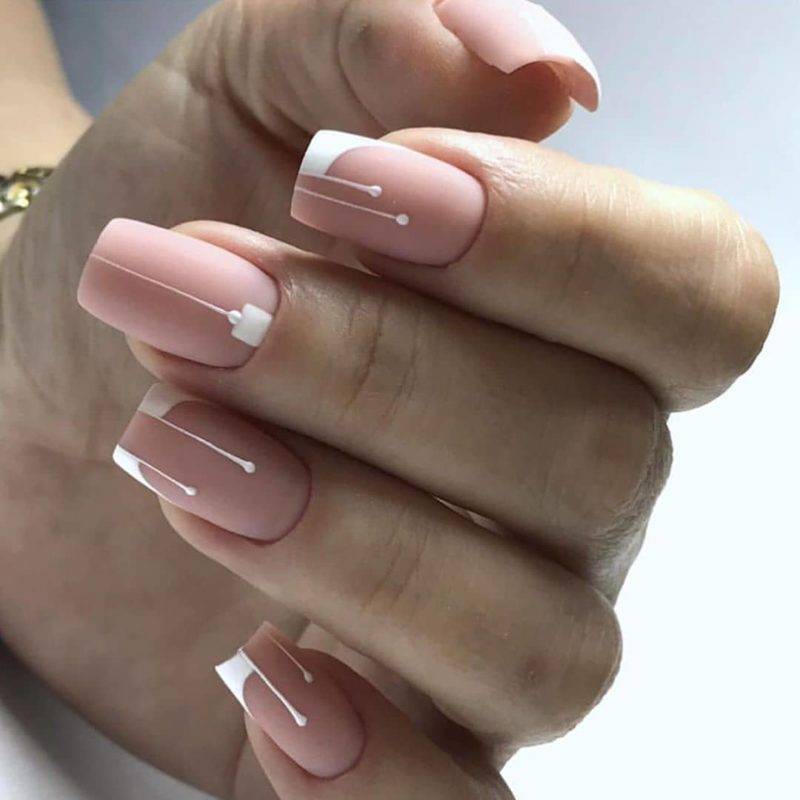 Французский маникюр на форму квадрат должен визуально скрадывать уголки пластины, делая ее более мягкой. Если длина средняя или короткая, французский маникюр дополняют дизайном, который визуально вытянет пластину. Например, абстрактным рисунком, располагая его по диагонали или вертикально. Или стразами — стильно и элегантно смотрится вертикальная полоска посередине ногтя.