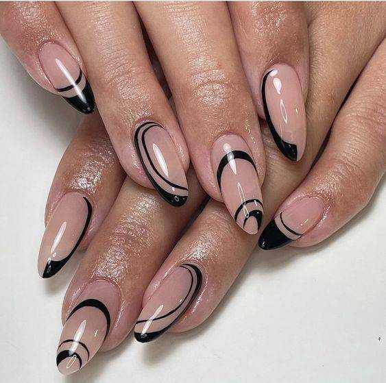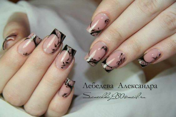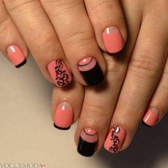 цвет коралл с черным маникюр френч полумесяцем с рисунком