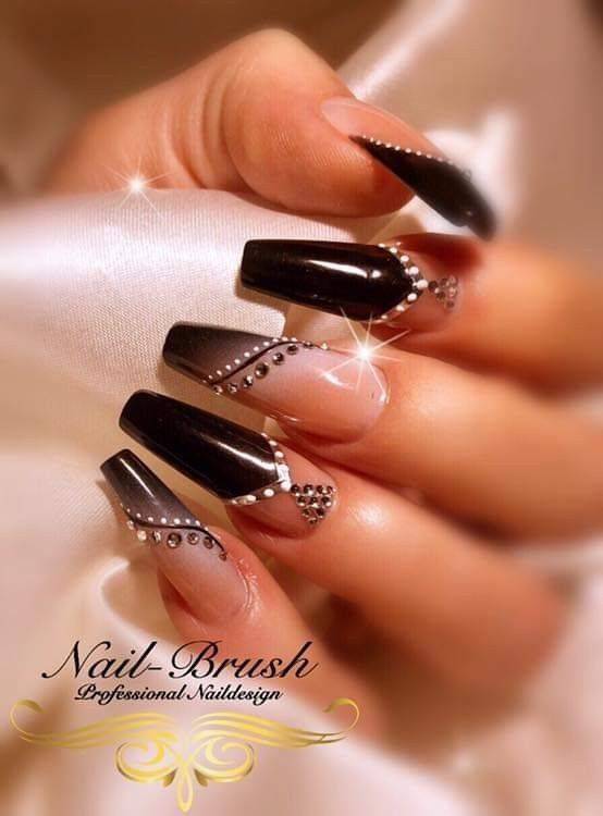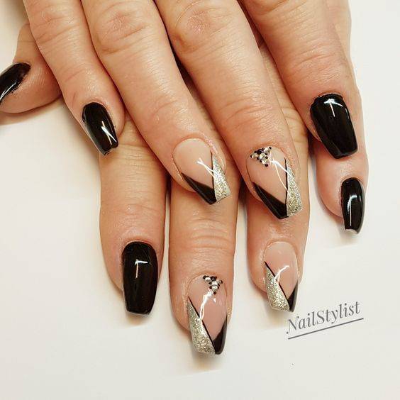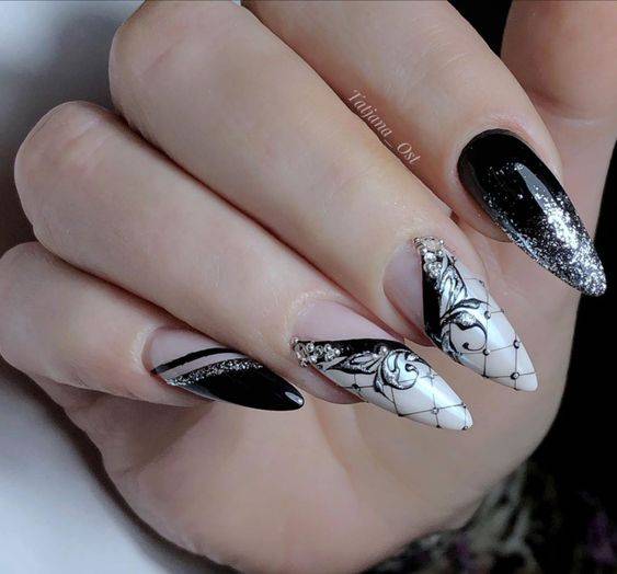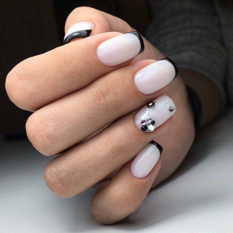 Черно-белые ногти с дизайном: с рисунком, со стразами, с блестками фото 2021-2022