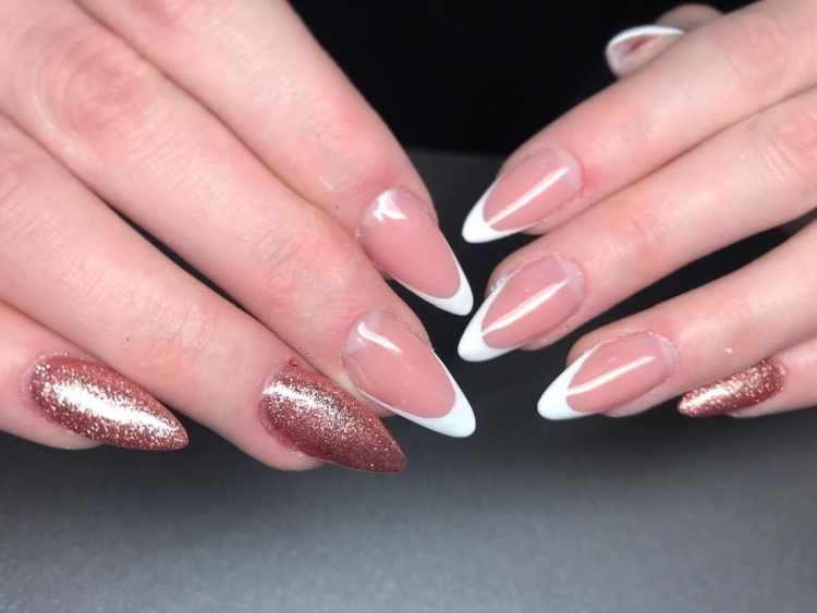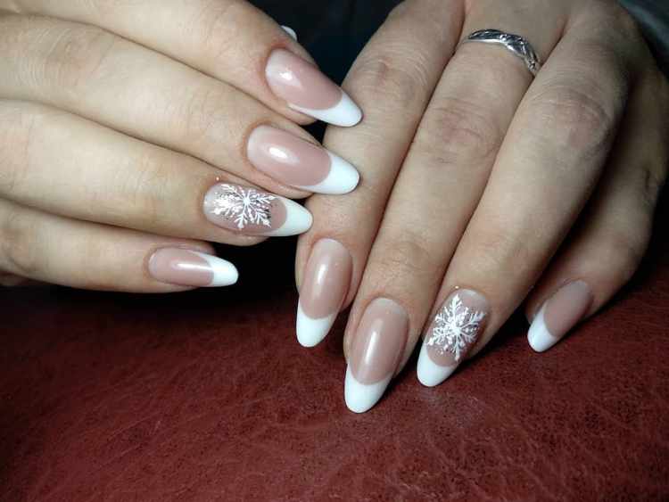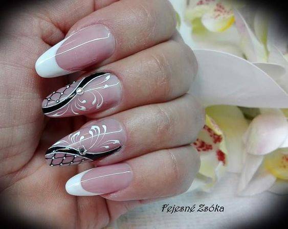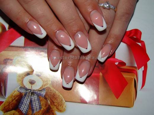 Острые ногти сегодня в тренде и френч идеальное решение для них. Но при такой форме ногтей не следует использовать ядовитые и яркие оттенки, это придаст вульгарности образу. Хорошо будет выглядеть геометрический рисунок на таких ногтях. Дизайнеры советуют простой и женственный вариант – натуральный цвет ногтей с широкой белой улыбкой.