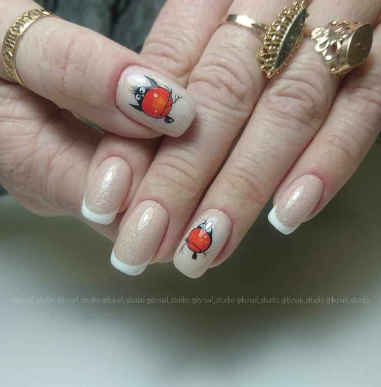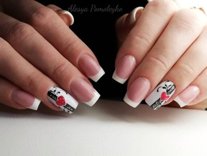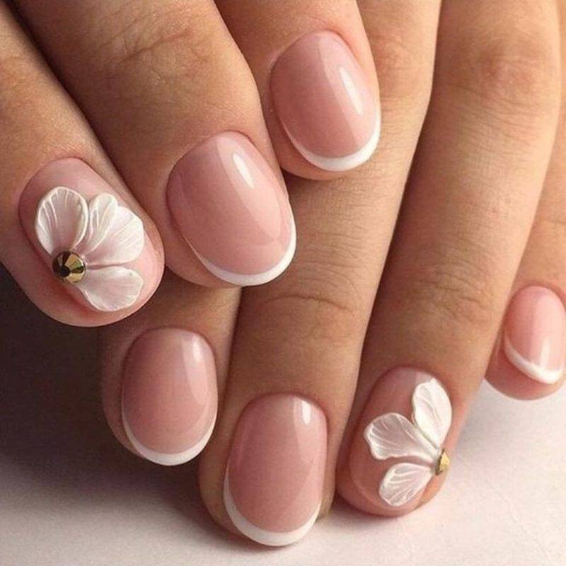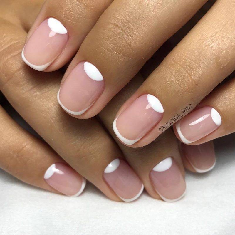 На коротких ногтях рассматриваемый френч смотрится стильно. Цвет ногтя может быть прозрачным или цветным, с белым пойдёт всё. Рисунок также любой, по настроению: цветочный орнамент, горошки, бантики. Кроме того, френч зрительно удлиняет ноготь.