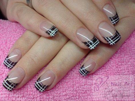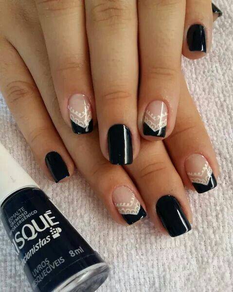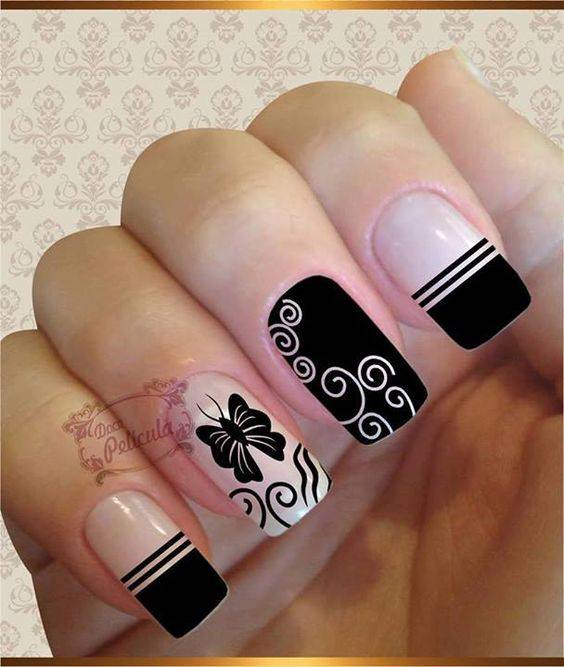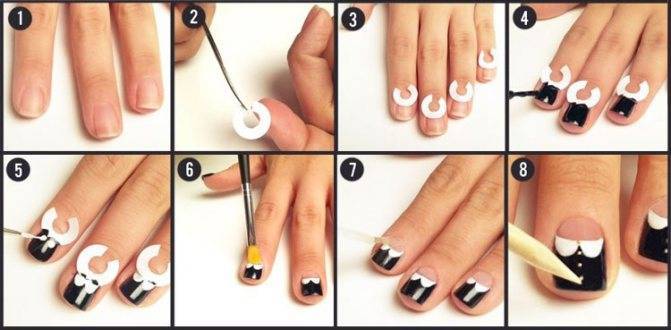 • Гусиная лапка – очень необычный и любимый всеми вариант принта, который мастер может как создать собственноручно, так и воспользоваться соответствующими заготовками в виде стикерованных наклеек. При этом основа может быть как черной, а узор белым, так и наоборот. • Обратный френч – классический французский маникюр в такой цветовой гамме смотрится удачно с белым базисом и черными улыбками, а вот обратный (лунный), хорош и в таком, и в противоположном окрашивании основы и зоны лунулы. Поэтому немудрено, что девушки активно применяют его на своих ноготках, особенно, если они острые.• Полосатый принт – следующие в горизонтальном, вертикальном, диагональном направлении параллельные линии всегда хорошо сочетаются и смотрятся в этой цветовой группе. Поэтому есть смысл украсить ноготки именно в таком варианте, можно даже на разных ногтях воспользоваться разным векторным направлением прямых – эффект в любом случае будет довольно привлекательным.• Лабиринт – дизайн ногтей, напоминающий дорогу путника, ведущую по квадратному периметру от краев ногтевой пластины к ее центру, что выглядит необычайно интересно. Удачно в этом случае в качестве основы выбирать именно белый, а черным вести линию.