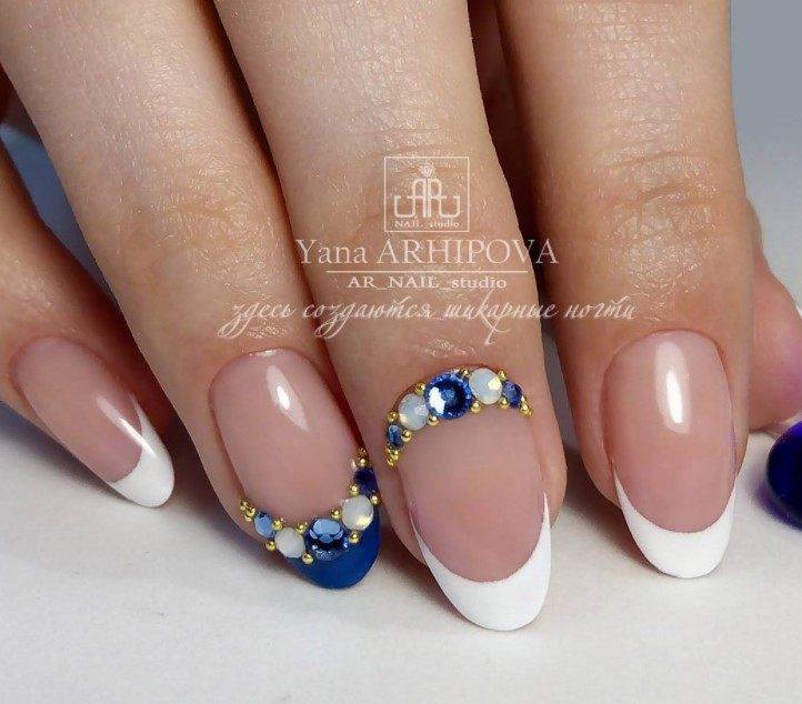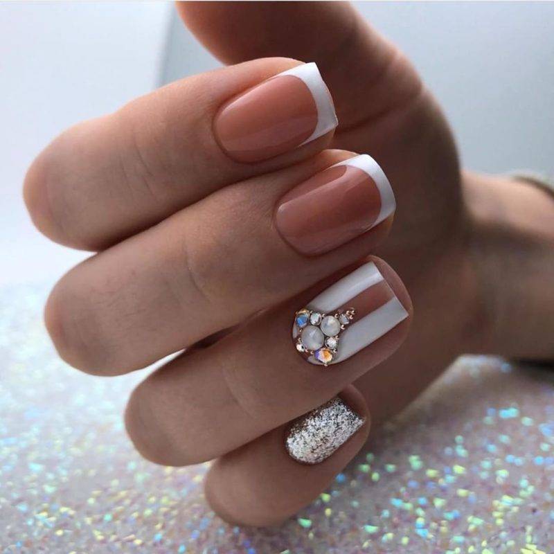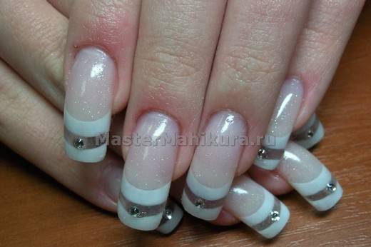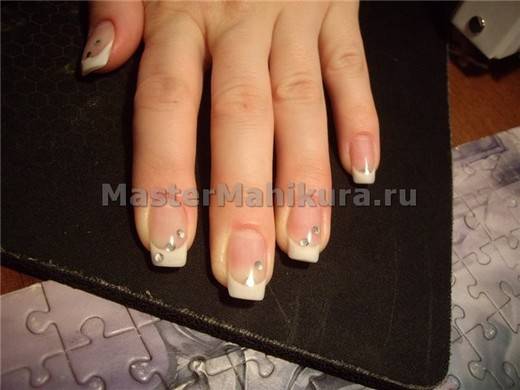 Французский маникюр со стразами смотрится очень эффектно, а выполнение его не очень трудное. По этой причине можно проводить данную процедуру и в косметологическом или маникюрном салоне, и в домашних условиях.